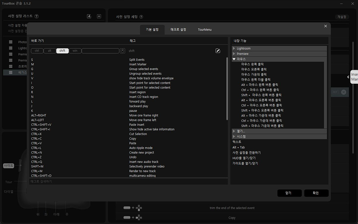 사용자가 직접 프리셋을 선택해서 해당 기능을 바꿀 수도 있지만 자동 전환을 선택하면 현재 활성화되어있는 프로그램으로 자동으로 프리셋이 바뀝니다. 이때는 해당 프리셋의 "미관련" 부분을 클릭해서 해당 프로그램을 미리 등록시켜야 하는데 이 기능이 아직 100% 호환되지는 않았습니다. 크롬(화면상 초로미)이나 다른 프로그램들은 등록이 되었지만 제가 사용한 베가스는 따로 등록이 되지 않더군요. 투어박스 네오와 같은 컨트롤러는 여러 가지 프로그램들에서 사용하기보다는 특정 작업(프로그램)을 위해서 사용되는 기기라고 생각해서 딱히 단점으로 생각되지는 않았습니다. 살짝 아쉬운 정도이긴 하지만 그래도 빠른 업데이트나 수정이 되었으면 좋겠습니다.