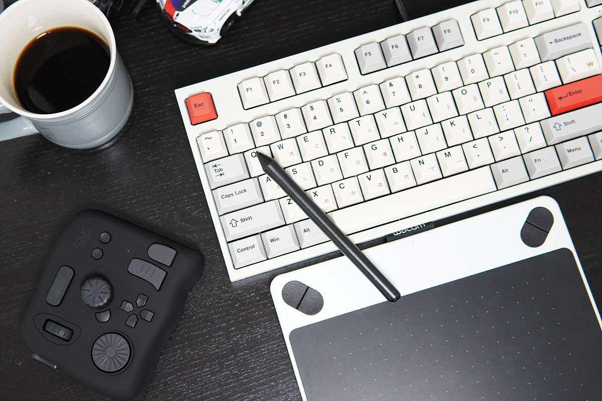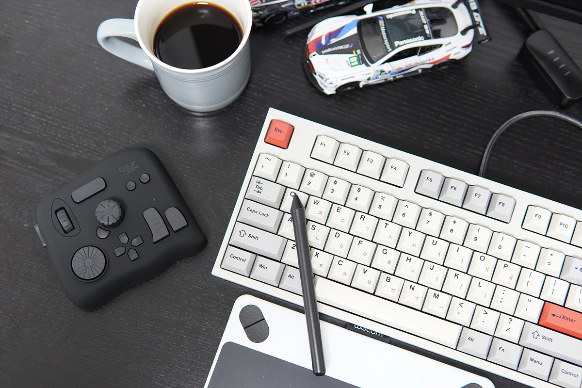 이런 일반적인 업무뿐만 아니라 포토샵, 일러스트, 프리미어같은 편집 프로그램은 문서 편집보다 훨씬 더 자주 단축키를 사용하게 됩니다. 마우스로도 작업이 가능하지만 메뉴 선택 -> 기능 실행 -> 다른 메뉴 선택 -> 기능 실행을 반복하다보면 손목의 피로도뿐만 아니라 작업 시간까지 길어지게 됩니다. 이번 시간에 소개하는 투어박스 네오(TourBox Neo)는 이런 단축키의 기능을 넘어서 특정 기능만을 따로 실행할 수 있는 멀티미디어 작업에 특화된 컨트롤러입니다. 키보드로 따진다면 하드웨어 매크로 기능을 가진 단독 키패드(keypad)라고 할 수 있죠.