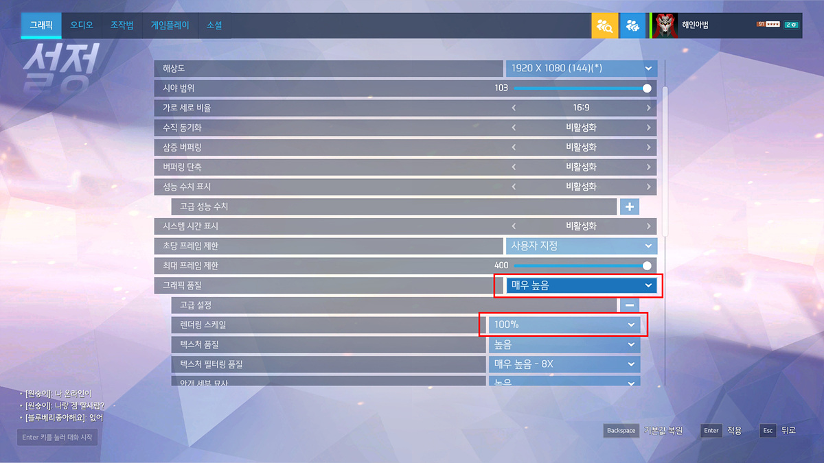 오버워치의 옵션은 FHD(1,920 x 1,080) 해상도에 매우 높음 프리셋으로 랜더링 100%를 적용했습니다.