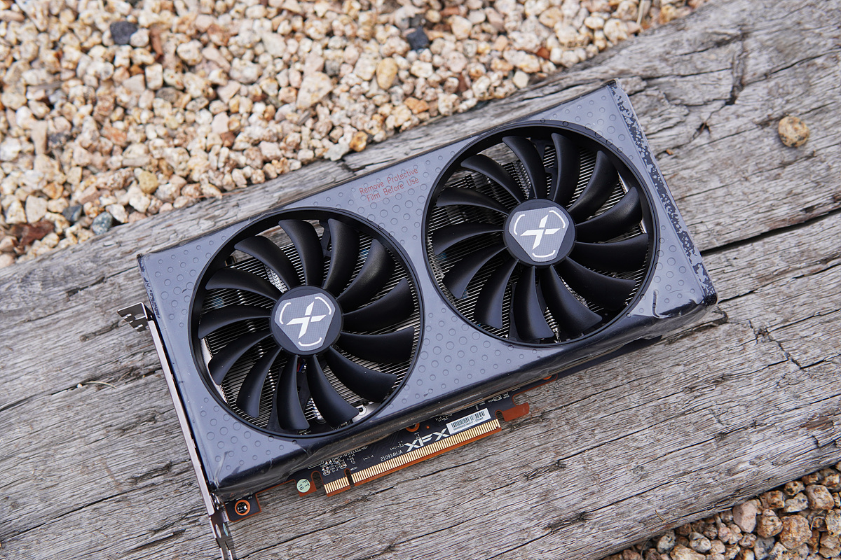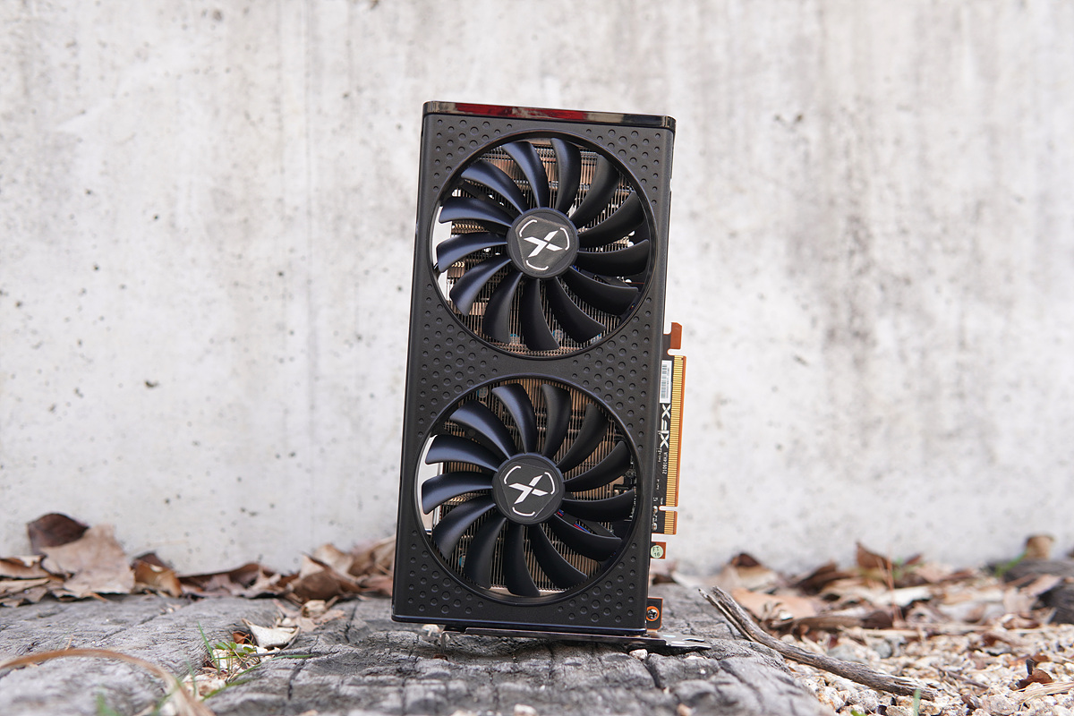 짧은 길이와 함께 2 슬롯의 두께라 케이스에 장착할 때 불편할 일은 없습니다. 백플레이트도 그렇지만 브래킷에 이렇게 XFX 로고를 만든게 정말 좋더군요. 출력 단자는 HDMI, DP 두 개가 있어서 듀얼 모니터를 사용하는 분들은 괜찮겠지만 3대 이상의 모니터를 사용해야 하는 분들은 상위 기종으로 선택을 해야 합니다.