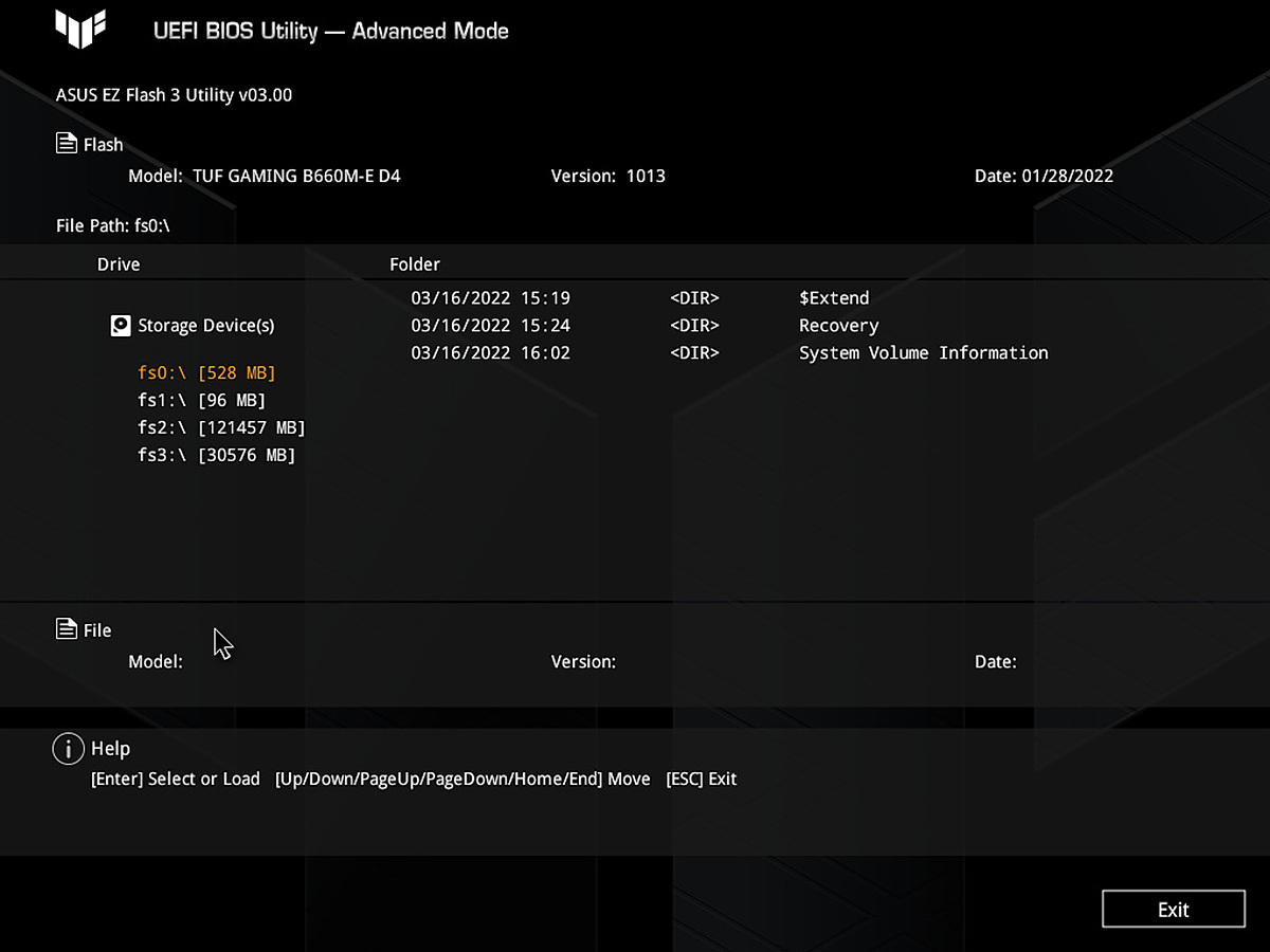 메인보드의 펌웨어 업데이트를 할 수 있는 EZ Flash 화면입니다.