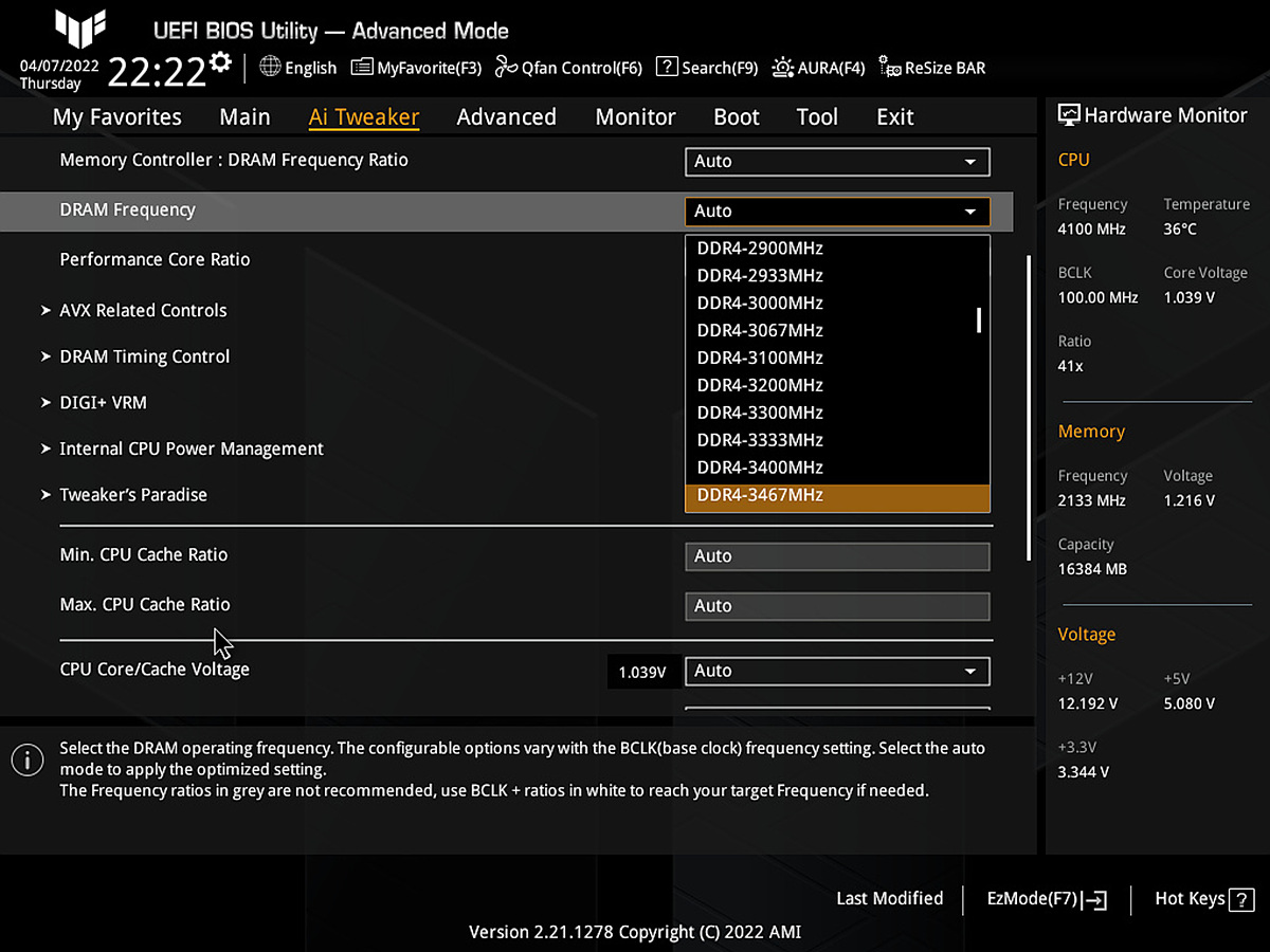AI Tweaker에서는 메모리의 클럭, 타이밍과 전압 등을 바꿔서 오버클럭이 가능합니다.