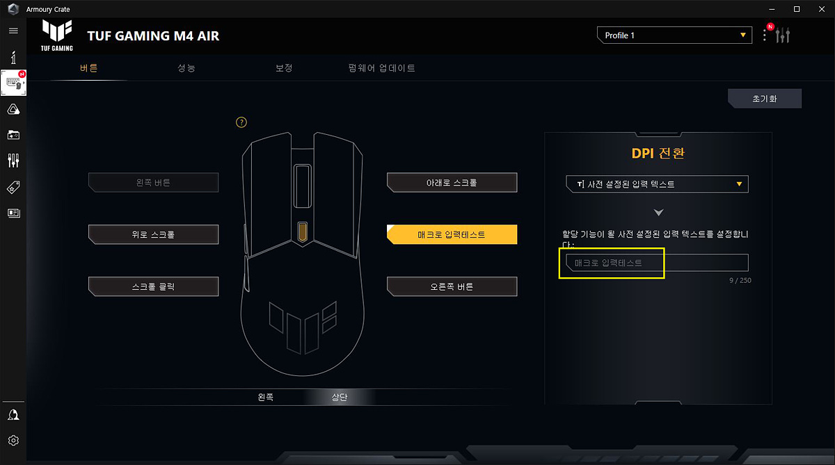 TUF M4 AIR 마우스는 ASUS의 통합 소프트웨어인 Armoury Crate를 통해 3개의 프로필을 만들 수 있으며 마우스의 기능을 바꿀 수 있습니다. 버튼 / 성능 / 보정 / 펌웨어 업데이트 4개의 탭으로 구성이 되어있으며 LED가 없어서 AURA Sync와 같은 RGB 연동은 할 수 없습니다. 이 부분 역시 사용자에 따라 호불호가 나뉘겠지만 개인적으로는 RGB가 없어서 아쉽지는 않았습니다.