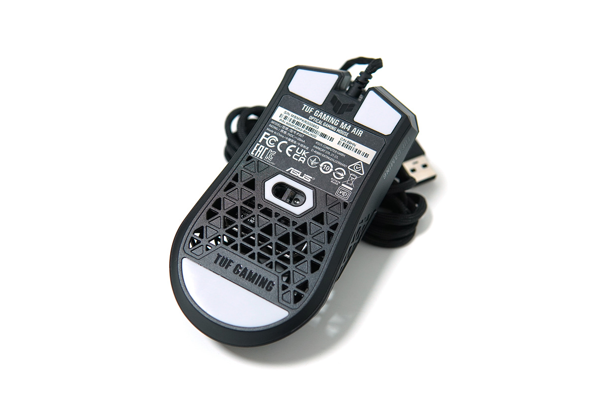 TUF M4 AIR의 외형은 좌우 대칭형으로 되어있지만 왼쪽에 엄지 버튼으로 오른손 전용이며 삼각형의 타공 구멍(hole) 역시 가운데를 기준으로 좌우 대칭으로 이루어져 있습니다. 타공 마우스는 제품별로 여러가지 다른 모양을 하고 있는데 ASUS에서는 조금은 독특(?)하게 삼각형으로 타공을 했습니다.
