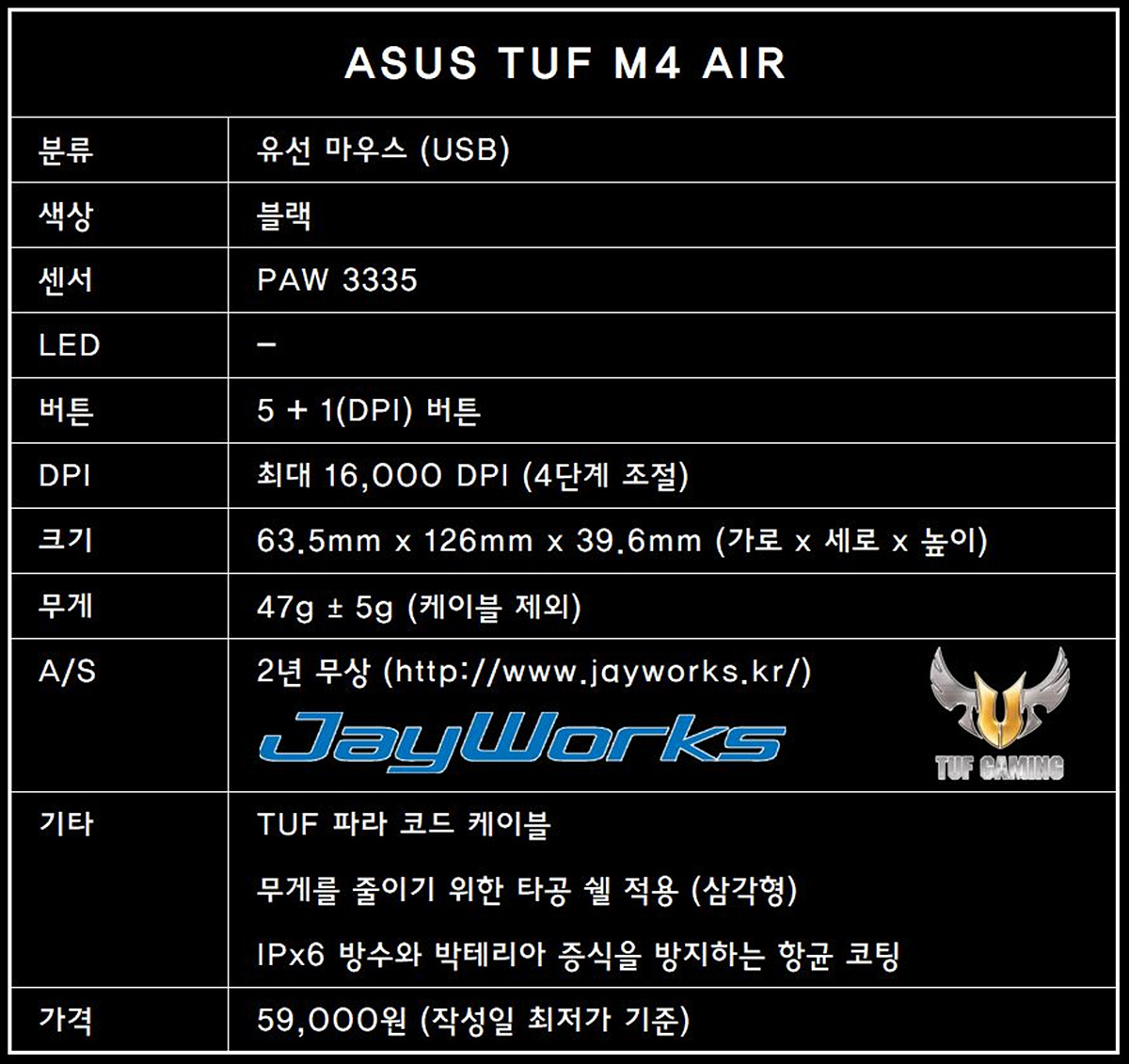 TUF M4는 다른 경량 마우스들과 마찬가지로 가벼운 무게에 잘 어울리는 파라 코드 케이블을 적용해서 사용자의 편의성을 높였으며 쉘에 구멍이 있는 단점을 보완하고자 IPx6 등급으로 방수 기능을 높였습니다. TUF M4는 크기는 일반 마우스들과 비슷하지만 47g으로 다른 경량 마우스보다 10g 이상 가벼운 무게를 자랑하고 있습니다. 마우스의 외형이나 그립감, 기능에 대해 좀 더 자세하게 살펴보도록 하겠습니다.