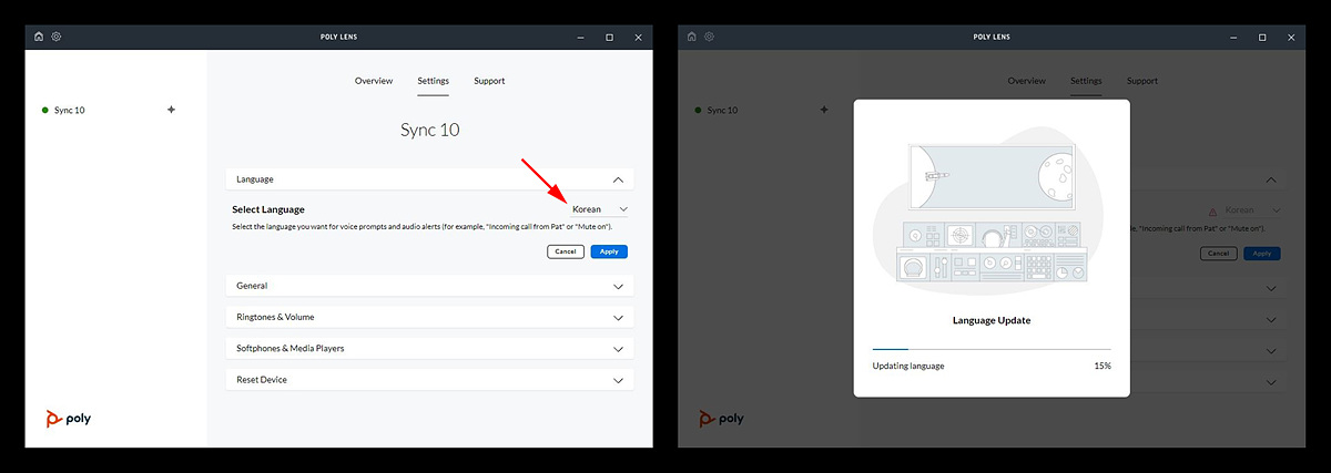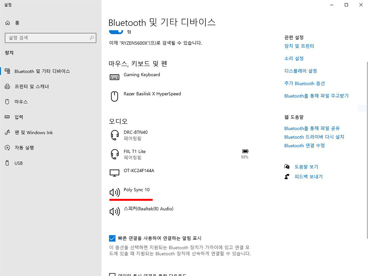 PC와 연결하면 바로 Poly Sync10 스피커폰을 확인할 수 있습니다.