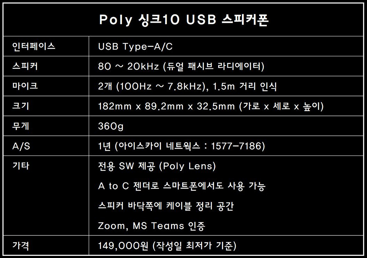 Poly Sync10 USB 스피커폰은 MS의 팀즈(Teams) 인증과 줌이나 스카이프 등의 플랫폼에서도 바로 사용할 수 있으며 Mac, Windows와 Type-C 포트를 사용하는 스마트 기기에서도 사용할 수 있어서 OS나 플랫폼을 가리지 않고 폭넓게 사용할 수 있습니다. 실제 제품의 외형이나 기능과 성능에 대해서 좀 더 자세하게 살펴보겠습니다.