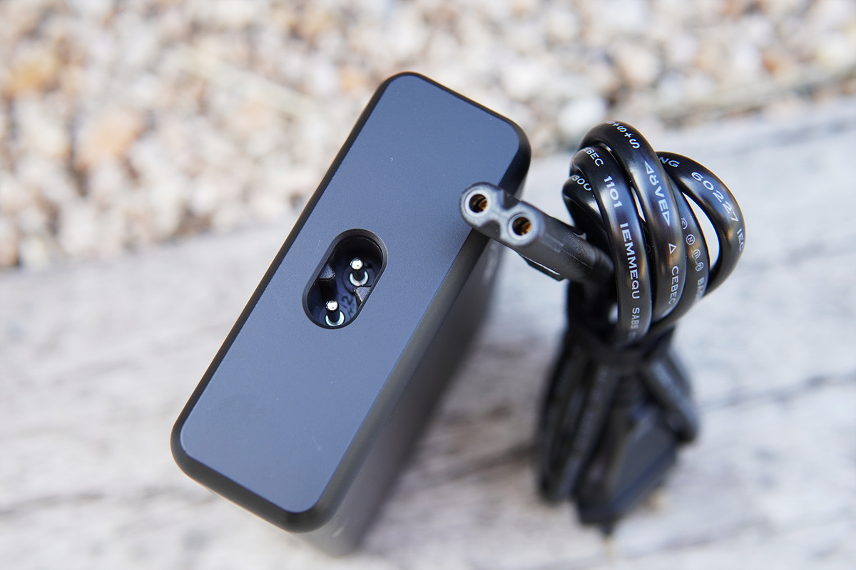 분리형 케이블 방식에 프리볼트를 지원하고 있어서 외국에서 사용하더라도 변환 플러그 없이 케이블만 바꿔서 사용할 수 있습니다. 플러그 방식이나 분리형 충전기는 각각의 장단점이 있으니 취향에 맞게 선택을 하시기 바랍니다. 케이블은 2핀 방식으로 접지가 되어있지는 않습니다. 플러그 방식의 일체형 충전기들은 접지를 지원하는 제품들이 많아지고 있지만 분리형 제품들은 아직까지는 그리 많지 않고 가격 역시 비싼 편이라 딱히 단점으로 생각되지는 않았습니다. 현재 비슷한 스펙에 접지가 되는 제품들의 가격은 거의 두배 정도 차이가 납니다.