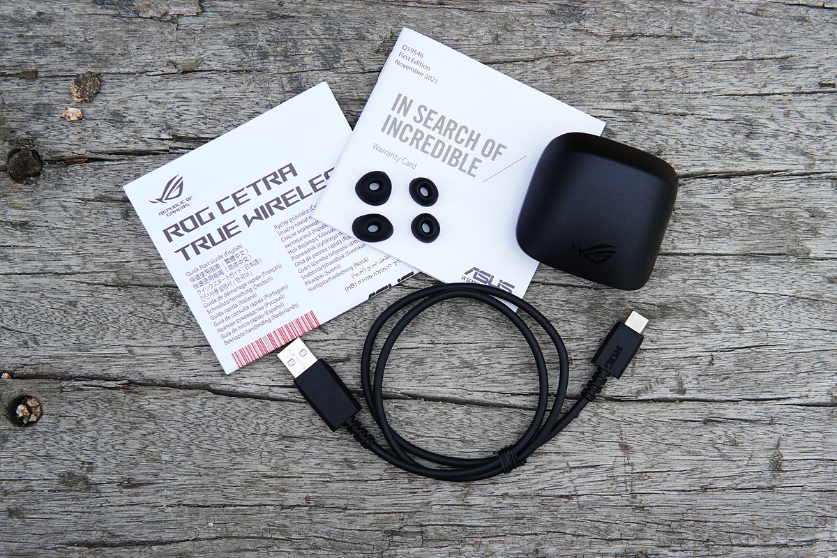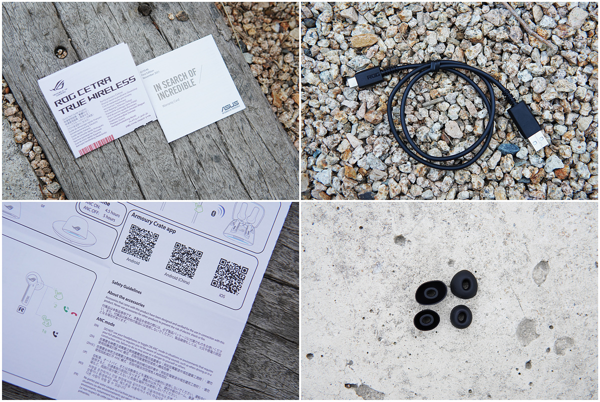 TWS 본체와 설명서, 충전용 케이블, 추가 이어 팁 두 쌍으로 이루어져 있습니다. 충전용 케이블은 다른 TWS 이어폰들에 비해 좀 더 긴 편으로 커넥터에는 ROG 로고가 있습니다.