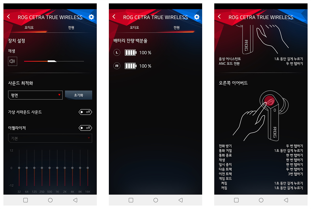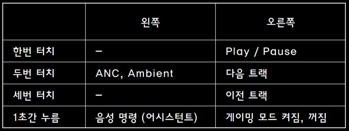 이어 버드의 ROG 로고 부분을 터치하면 기능을 바꿀 수 있으며 좌우로 기능이 분리되어 있습니다. 노이즈 캔슬링의 기능은 ANC Off - 헤비 - 라이트 - 앰비언트 모드 순서로 바뀌게 됩니다. 노이즈 캔슬링, 앰비언트, 게이밍 모드의 변경은 모두 음성으로 안내가 됩니다.