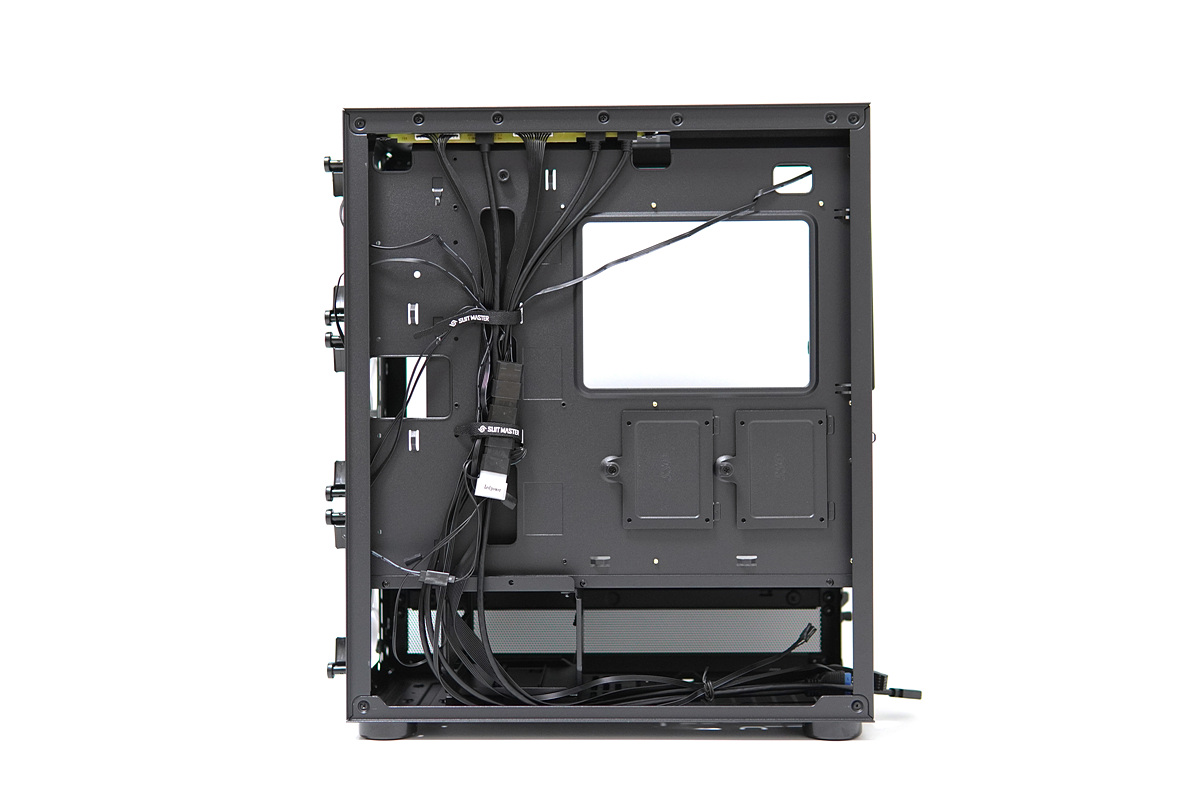 미들타워 케이스이지만 일반적인 미들타워의 케이스보다는 조금 더 큼직합니다. 120mm가 아닌 140mm 팬이 장착이 되다 보니 케이스를 정면에서 봤을 때 가로 폭이 좀 더 큽니다. 파워가 장착되는 부분과 강화유리가 따로 분리가 되어있는 구조이며 아래쪽 커버와 오른쪽 커버에는 별도의 홀(hole)이 있습니다.