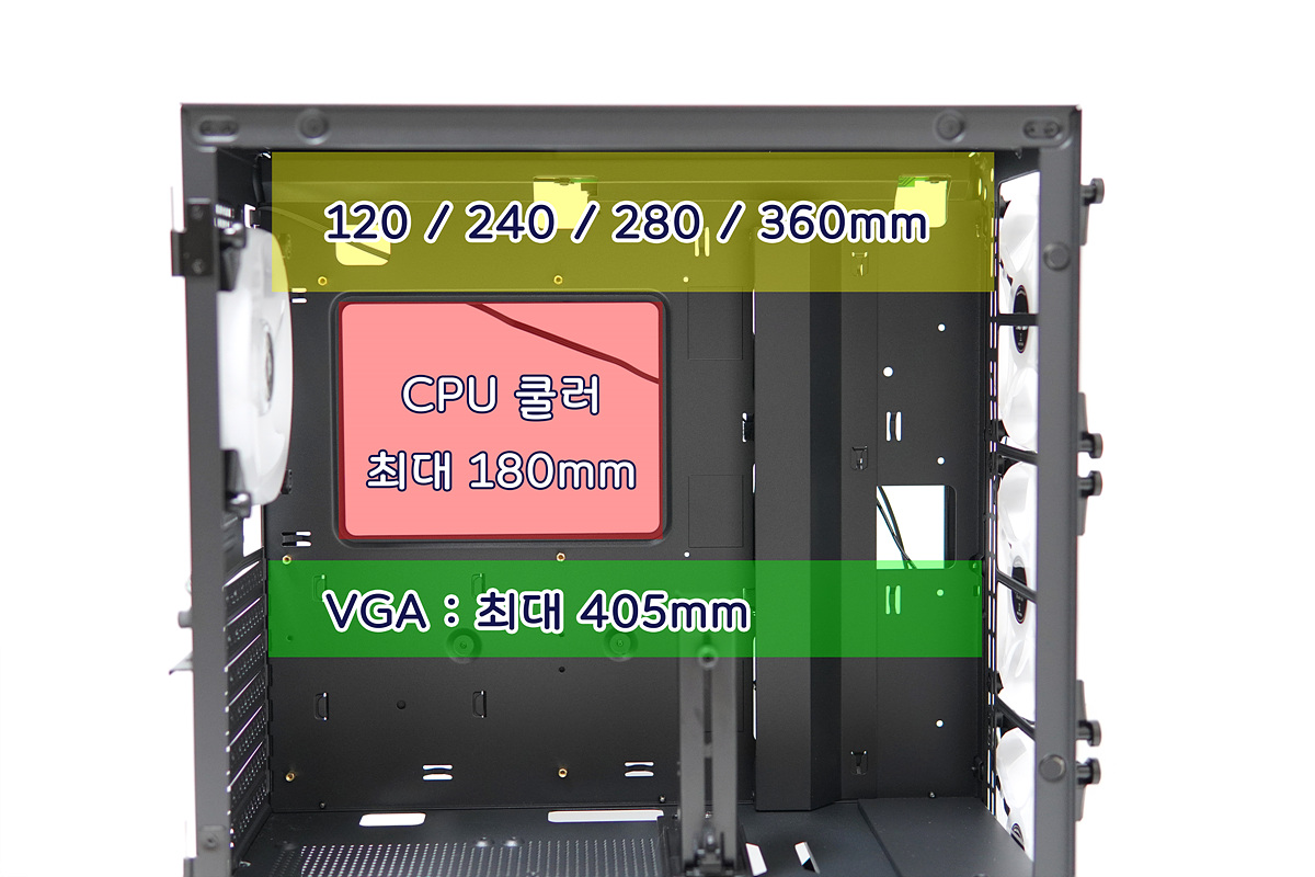 케이스 위쪽에는 수랭 쿨러를 위한 라디에이터를 장착할 수 있으며 최대 120mm 3열(360mm)까지 지원합니다. 앞쪽 역시 같은 크기를 사용할 수 있으며 3열 라이에터를 장착하려면 커버를 분리해야 합니다. CPU 쿨러나 VGA 역시 케이스의 크기 때문에 장착이 안 되는 경우는 없을 정도로 대부분의 제품을 장착할 수 있습니다.