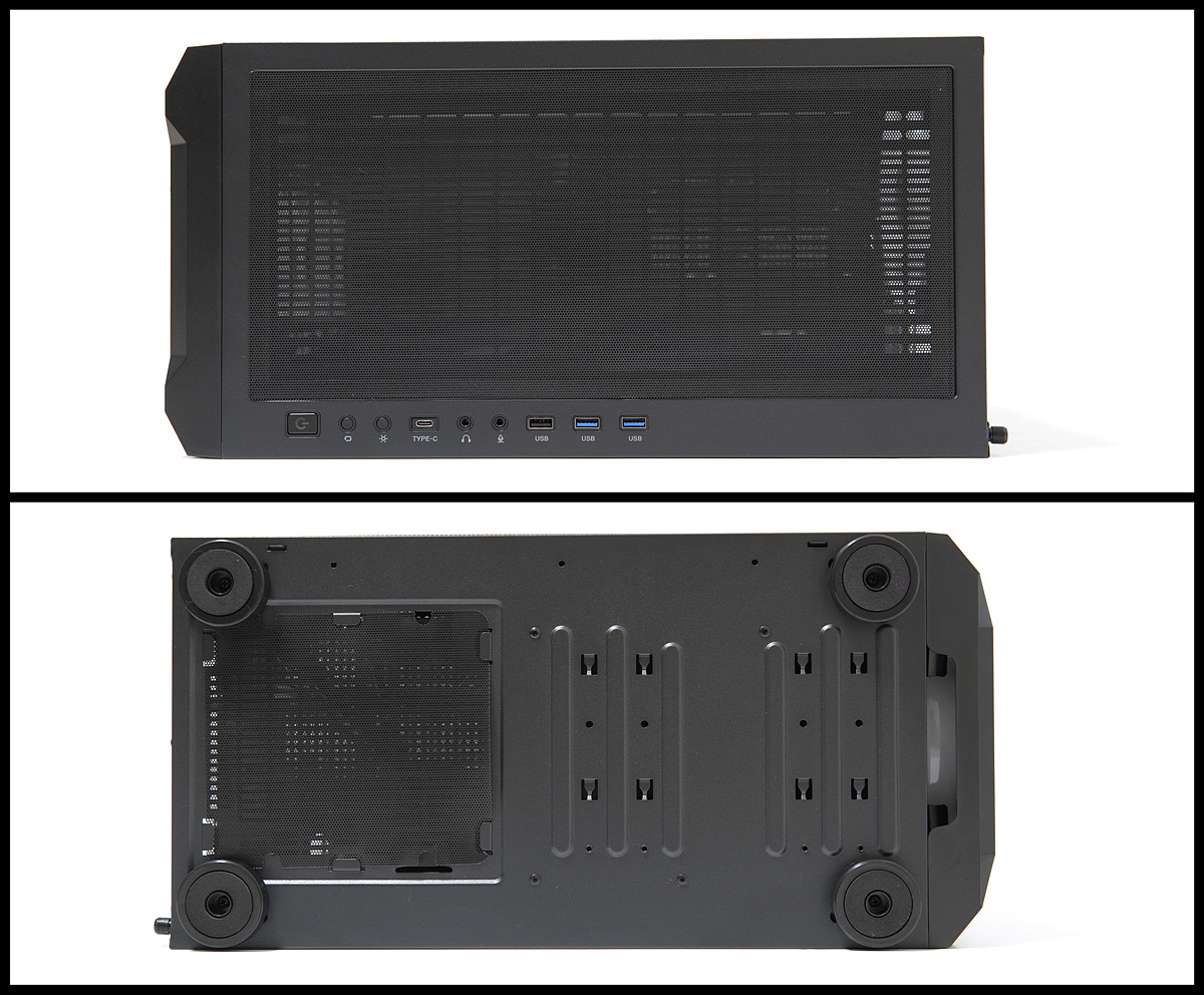 전원이나 LED 변경을 위한 버튼과 함께 3개의 USB 포트가 있고 추가로 Type-C 포트도 배치가 되어있습니다. 10만 원 미만 케이스들에서는 좀처럼 보기 힘든 구성이라 반갑더군요. 먼지필터는 위/아래 모두 장착되어 있으며 위에는 마그네틱 방식이고 아래쪽은 일반 필터로 장착이 되어있습니다. 아주 고가형의 제품은 아니지만 그래도 슬라이딩 방식의 커버를 장착했다면 좀 더 좋았을 거 같네요.
