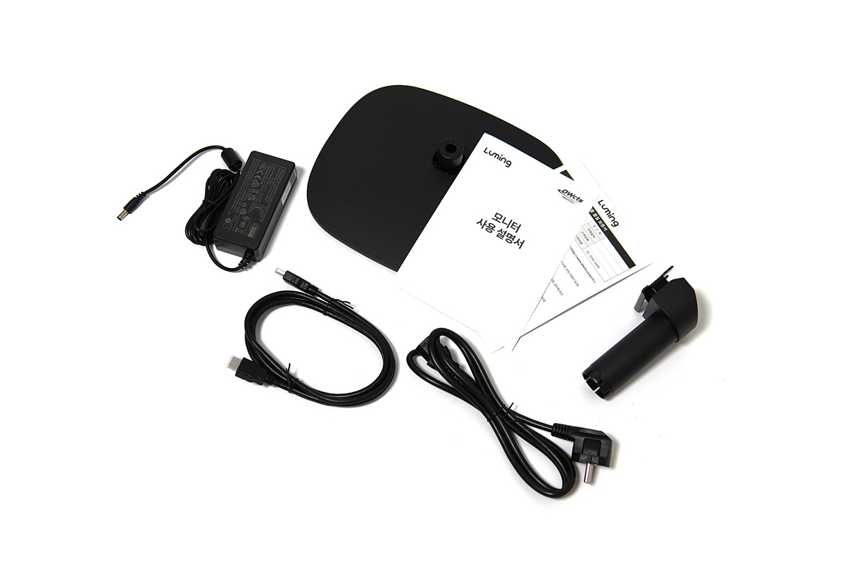 스탠드와 넥(neck)은 별도의 공구가 필요 없이 원터치로 방식으로 조립할 수 있으며 HDMI 케이블 한 개가 포함되어 있습니다. 모니터의 어댑터는 12V / 4A의 출력을 가지고 있습니다.