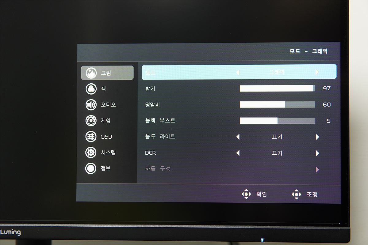 오른쪽의 조그 스틱을 누르면 전원이 켜지고 2초 정도 누르면 모니터의 전원이 켜집니다. 전원이 켜진 상태에서 조그 스틱을 누르면 OSD 메뉴가 나옵니다. 보급형 라인이나 중소기업 모니터들을 테스트하면 대부분 비슷한 OSD 화면을 보게 되는데 한글 폰트나 번역이 이상하게 되어있는 제품들이 많은데 루밍 제품은 이쪽에도 신경을 좀 쓴 거 같네요. 조그 스틱 방향에 따른 빠른 메뉴를 지원하지 않는 부분은 아쉬웠습니다.