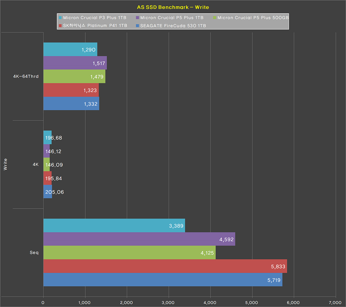 순차 쓰기에서는 다른 제품에 비해서 좀 낮은 편이었지만 스펙을 만족하고 있고 역시나 4K에서는 P5 Plus 제품보다 더 좋은 결괏값을 보여주었습니다.