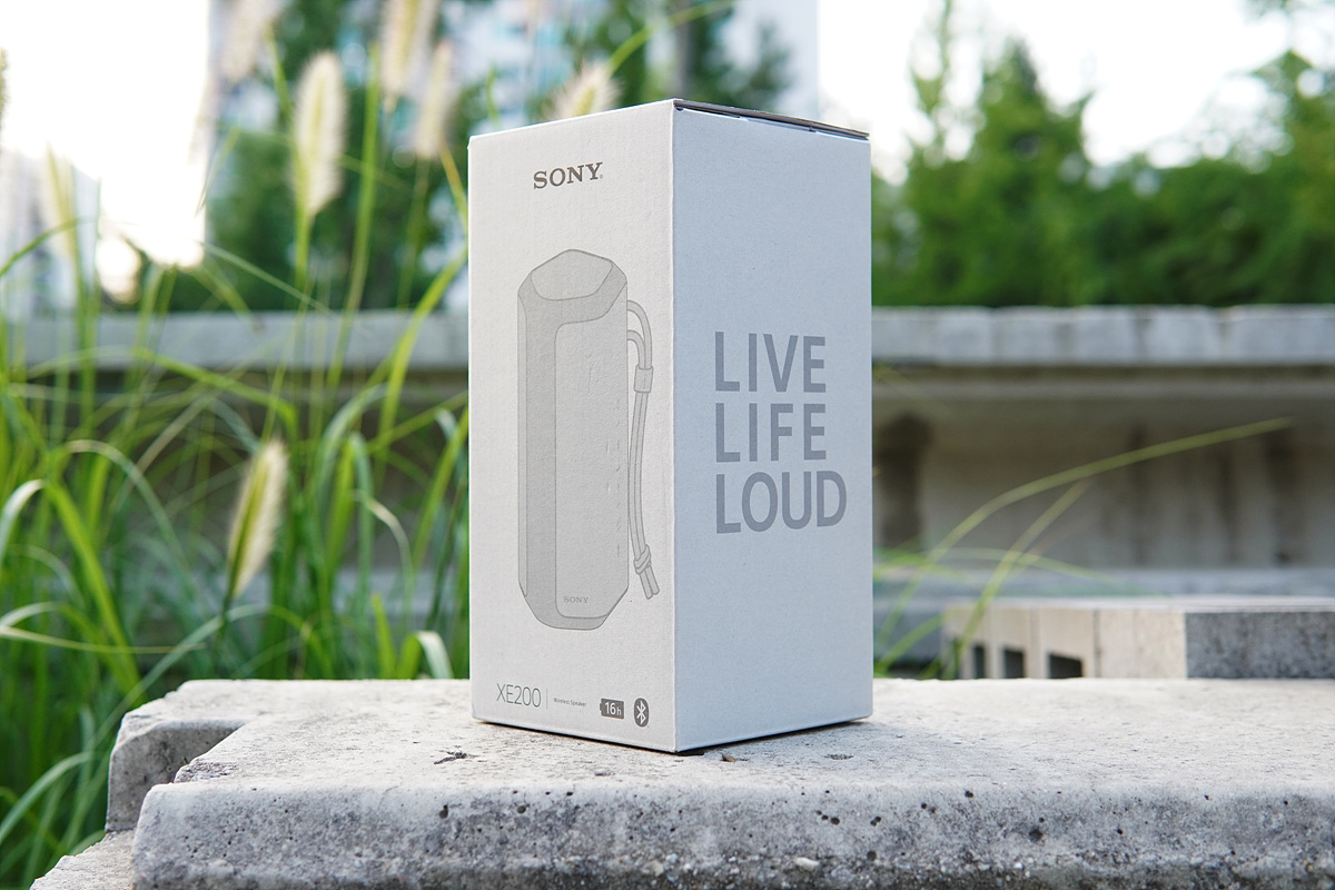 SRS-XE200 스피커의 특징들과 함께 슬로건인 "Live Life Loud"를 확인할 수 있습니다.
