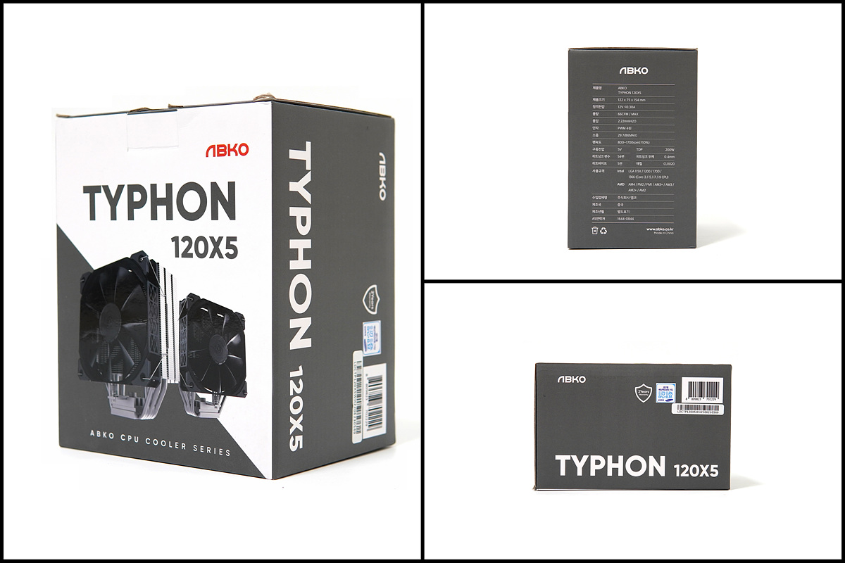 박스에는 쿨러의 스펙이나 특징들이 자세하게 표시되어 있습니다. 박스에 표시되어있는 생산물 배상책임보험 부분과 2년의 고객지원이 마음에 들었습니다. 타이폰 120X5는 쿨러의 RGB에 따라 ARGB / nonRGB 두 가지가 있으며 제가 소개하는 제품은 nonRGB 버전입니다.