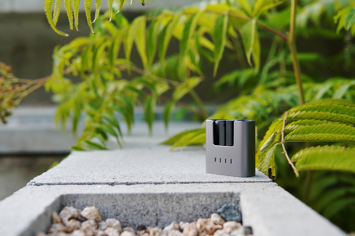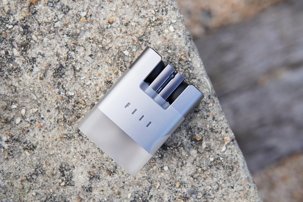 케이스 전체는 알루미늄 재질로 상당히 깔끔하며 애플 기기의 스페이스 그레이와 거의 똑같은 색입니다. 앞쪽에는 FIIL 로고가 있으며 커버(뚜껑)가 없는 다소 특이한 모양을 하고 있습니다.