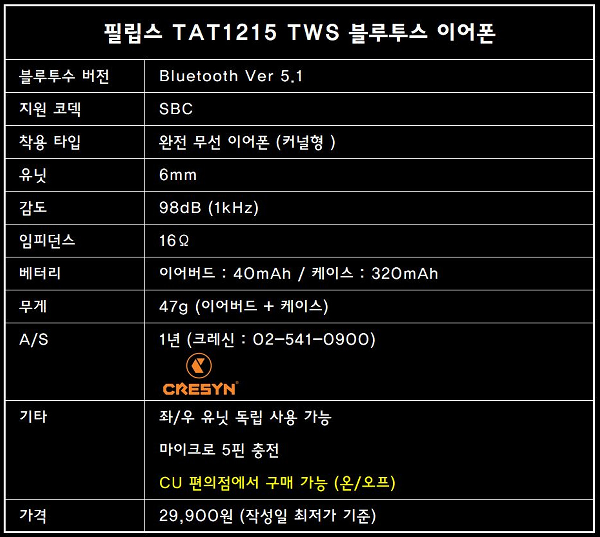 제가 사는 동네 CU에서는 아직까지 매장 판매가 되지 않았지만 앞으로 점점 판매되는 매장과 판매율이 높아진다면 단순히 TAT1215 이 제품뿐 아니라 더 많은 제품들로 확대가 될 거라 예상이 됩니다. 이어폰의 가장 중요한 음질에 있어서는 솔직히 좋은 평을 할만한 제품은 아니었습니다. 소리 외적으로도 노캔이나 무선 충전과 같은 특별한 부가 기능은 역시 없어서 가성비적인 부분에서도 뛰어난 점은 찾기 힘들었습니다. 여행이나 출장 시 급하게 구입을 하거나 스페어로서의 역할이 잘 맞는 제품이라 오프라인에서 쉽게 구입할 수 있다는 점에서 만족해야 할 만한 기기라고 생각합니다. 제품의 장단점으로 마무리를 하겠습니다.