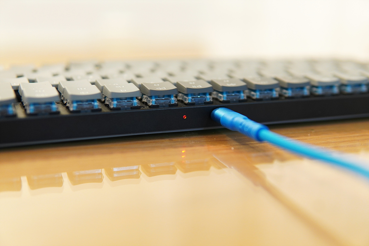 cable 모드로 선택하고 Type-C 케이블을 연결하면 유선 모드로 사용할 수 있으며 동시에 충전이 이루어집니다. 키보드가 충전 중에는 빨간색으로 완충이 되면 초록색으로 바뀝니다. 저는 이 LED의 위치가 아쉽더군요. 키보드의 디자인 때문이겠지만 현재 배터리나 충전 상태를 확인하려면 키보드를 들어서 확인해야 하는 점이 불편했습니다.