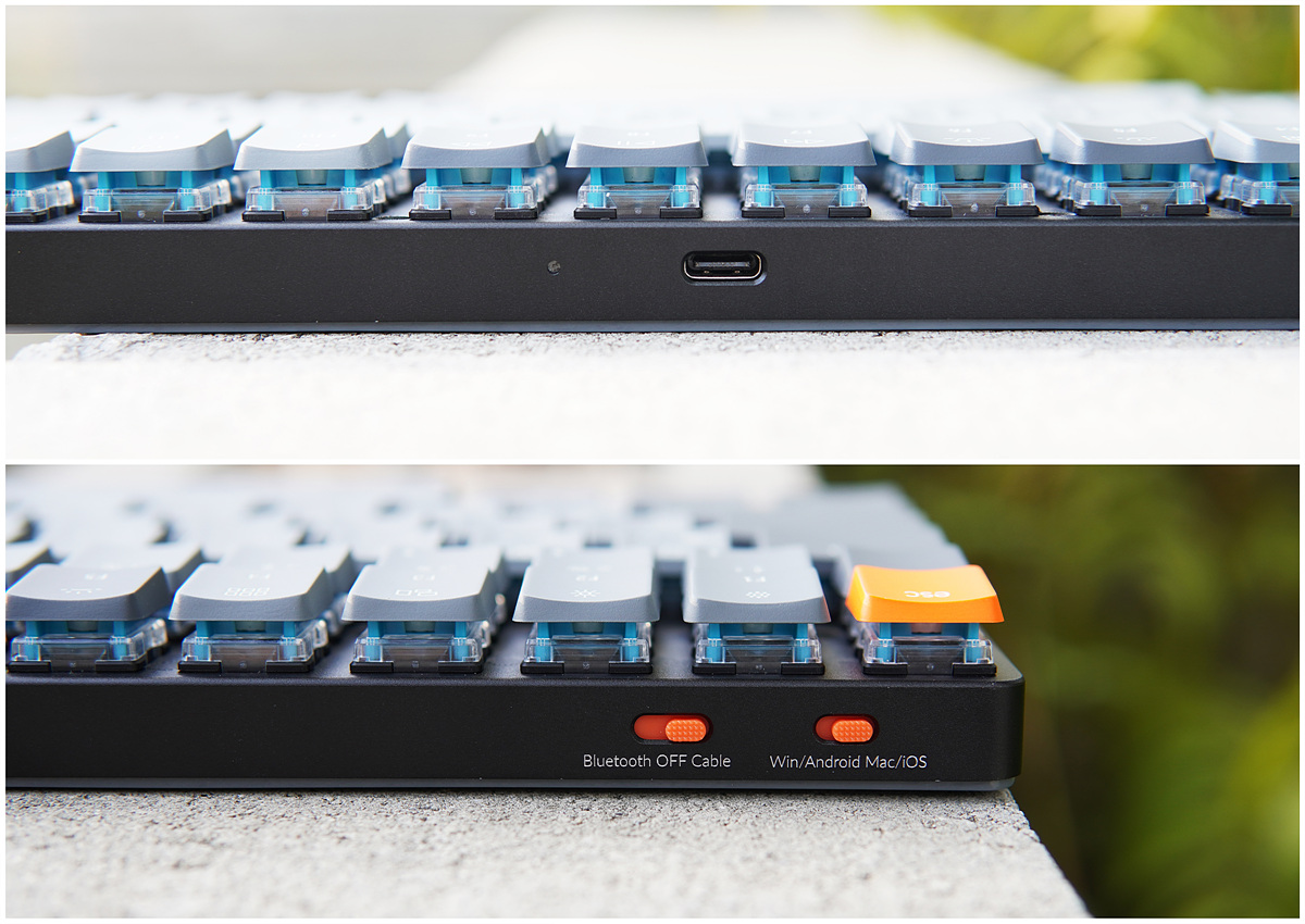 위쪽 측면에는 Type-C 포트, 배터리 상태를 확인할 수 있는 LED와 키보드 모드를 바꿀 수 있는 스위치가 있습니다. 케이블을 연결하더라도 스위치를 조절해야 유선 모드로 사용할 수 있으며 배터리의 활용을 위해 키보드의 전원을 끌 수도 있습니다. Windows와 Mac의 경우 사용되는 기능키, 펑션키에 대한 키 설정이 달라지므로 이 부분 역시 사용하는 환경에 맞게 선택을 해야 합니다.