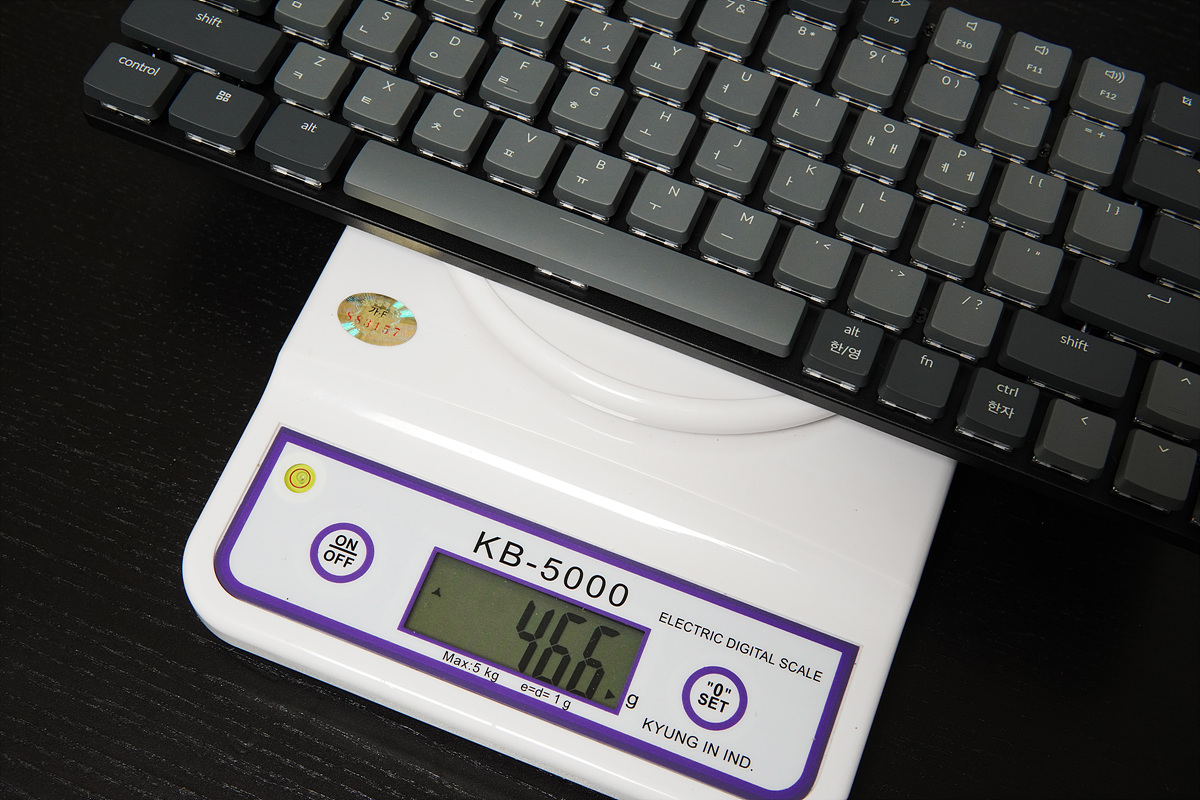 LP 스위치와 키캡을 사용해서 키보드의 높이는 100원짜리 동전보다 조금 낮으며 높은 다리를 세워야 동전보다 조금 더 높아지는 정도로 상당히 슬림합니다.