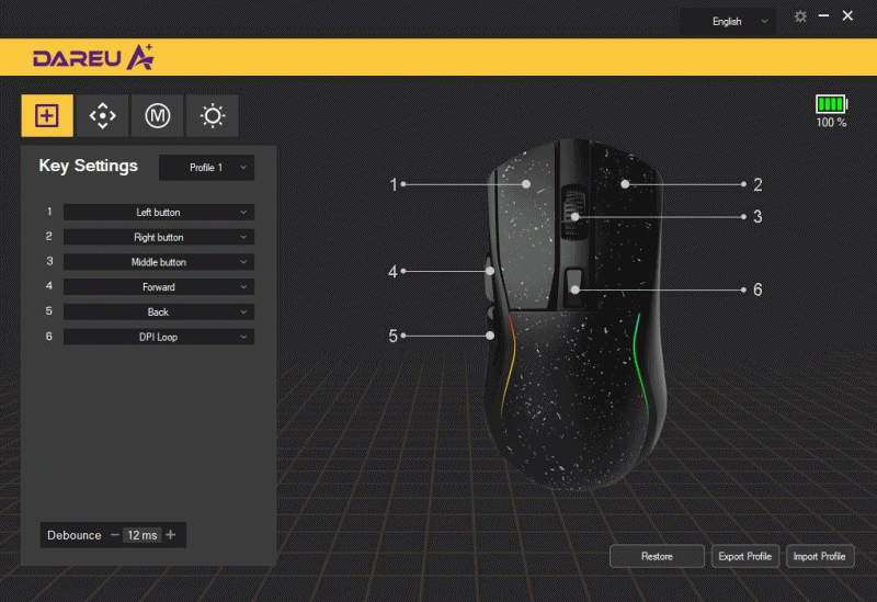 오른쪽 위의 언어 설정을 보니 영어 / 중국어 두 가지만 지원하네요. 설명서와 마찬가지로 이 부분 역시 빠르게 업데이트되길 바랍니다. 아래쪽의 Debounce 버튼의 클릭에 대한 입력 반응 속도를 설정하는 부분이라 너무 짧으면 클릭을 더블클릭으로 인식할 수도 있으니 너무 짧거나 길게 설정하는 건 피하는 게 좋습니다.
