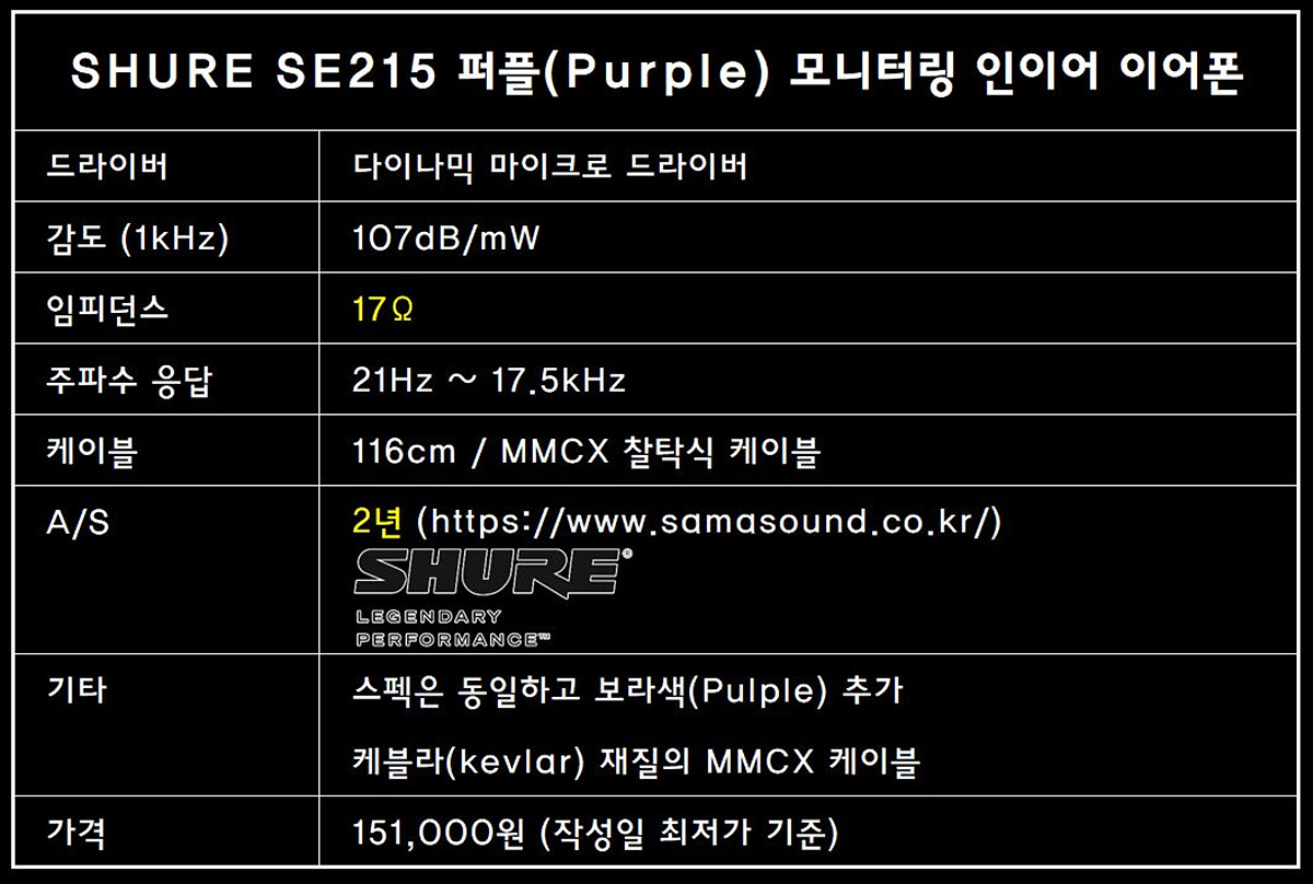 슈어에서는 전 세계 사용자들의 투표를 받아서 새로운 색(color)인 SE215 퍼플을 출시하게 되었습니다. 기존 제품들보다 성능적인 부분에서 업그레이드가 이루어지지는 않았지만 기본적인 성능 자체가 탄탄한 만큼 제품의 만족도는 상당히 높다고 생각합니다. 환율의 영향으로 이전 제품들보다 가격이 좀 올랐다는 게 아쉽지만 역시나 10만원대의 입문용 이어폰에서는 항상 추천하는 1순위입니다.