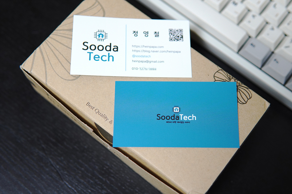 명함천국이란 사이트에서 만들었는데 제가 전부 작업할 필요 없이 기존 템플릿에 제가 가지고 있는 이미지 파일을 넣고 텍스트만 입력하면 뚝딱 만들어집니다. 만들고 나니 유튜브 핸들이 생겨서 그걸 못 넣은 게 무지 안타깝지만 그래도 "@SoodaTech"를 넣어서 그나마 다행이었습니다.