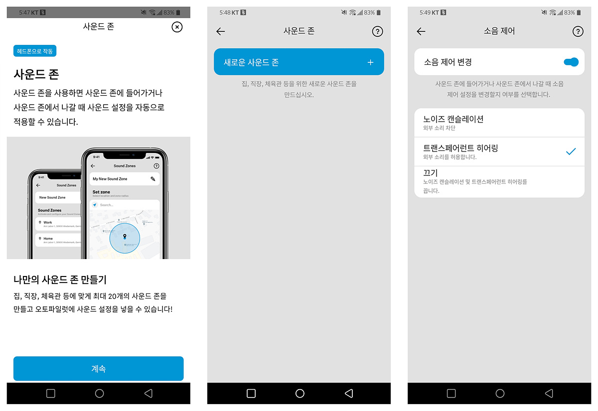 사운드 존은 위치에 따라 기기의 설정을 자동으로 변경하는 기능입니다. 지하철역에서 자동으로 노캔이 켜지게 하거나 집이나 사무실에 근처에서는 트랜스페어런트를 사용할 수도 있습니다.
