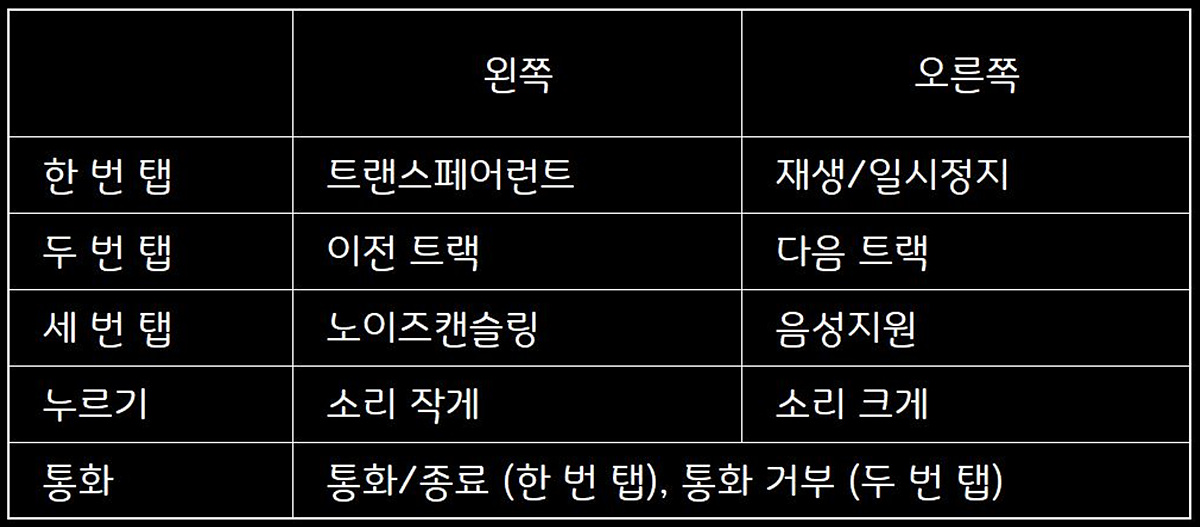 이어버드의 기본적인 기능은 위 표와 같으며 앱(Smart Control)에서 사용자에 맞게 바꿀 수 있지만 통화와 관련된 기능은 바꿀 수 없습니다. 개인적으로는 한번 터치는 없애고 두 번, 세 번으로만 설정하는 걸 추천합니다.