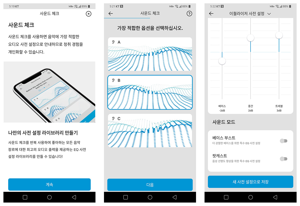 사운드 체크는 음악을 들으면서 더 좋은 소리를 선택하면 단계에 따라서 자동으로 EQ를 만들어주는데 꽤 편리합니다. 모멘텀 3을 사용할 때도 상당히 만족했던 기능인데 CX Plus SE에서도 사용할 수 있네요.