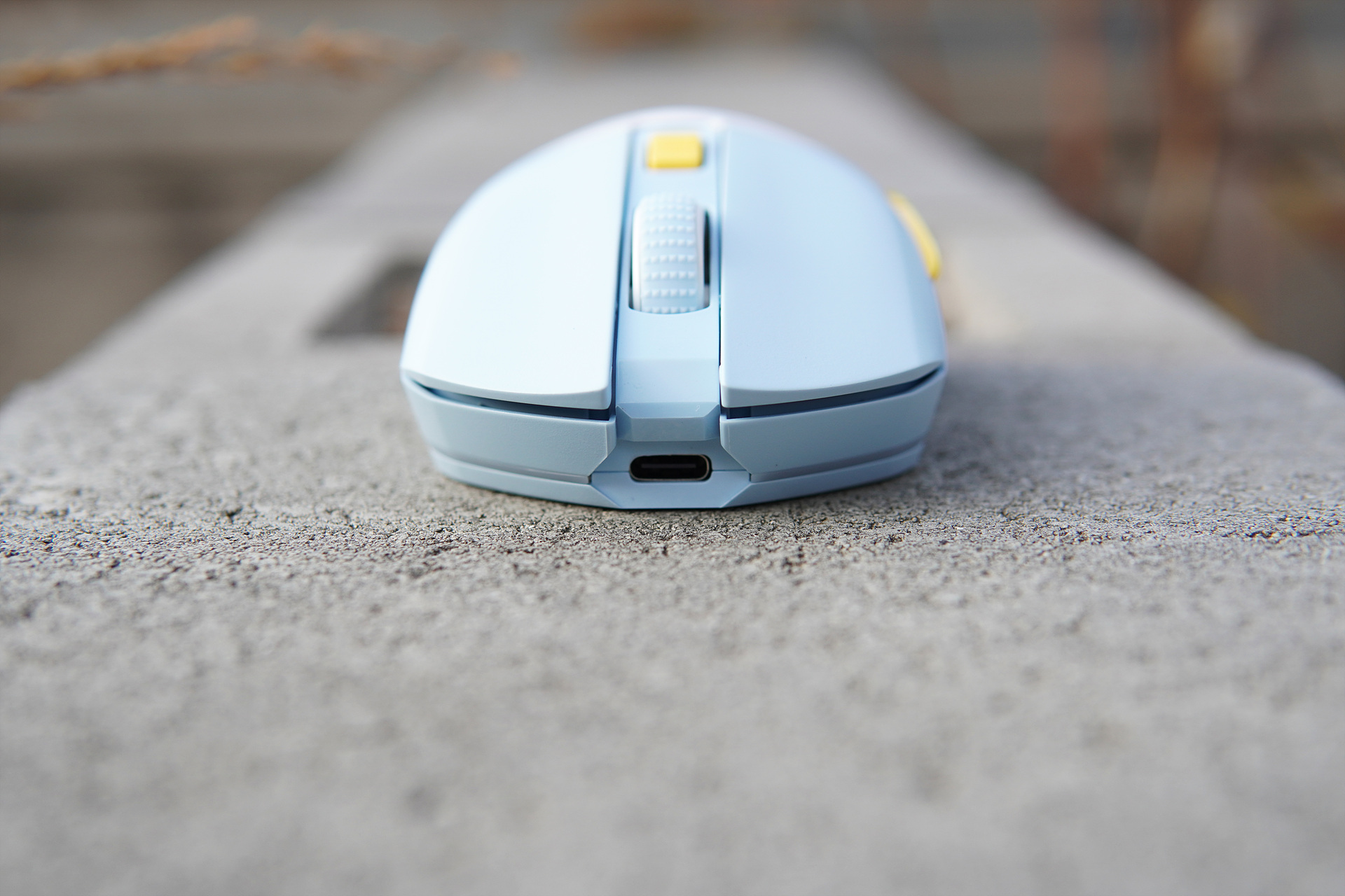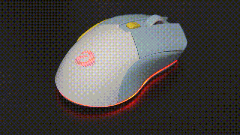 마우스는 대칭형으로 되어있으며 센서는 마우스 가운데에 위치하고 있으며 배터리 관리를 위한 On/Off 스위치와 RGB 버튼이 양쪽에 배치되어 있습니다.