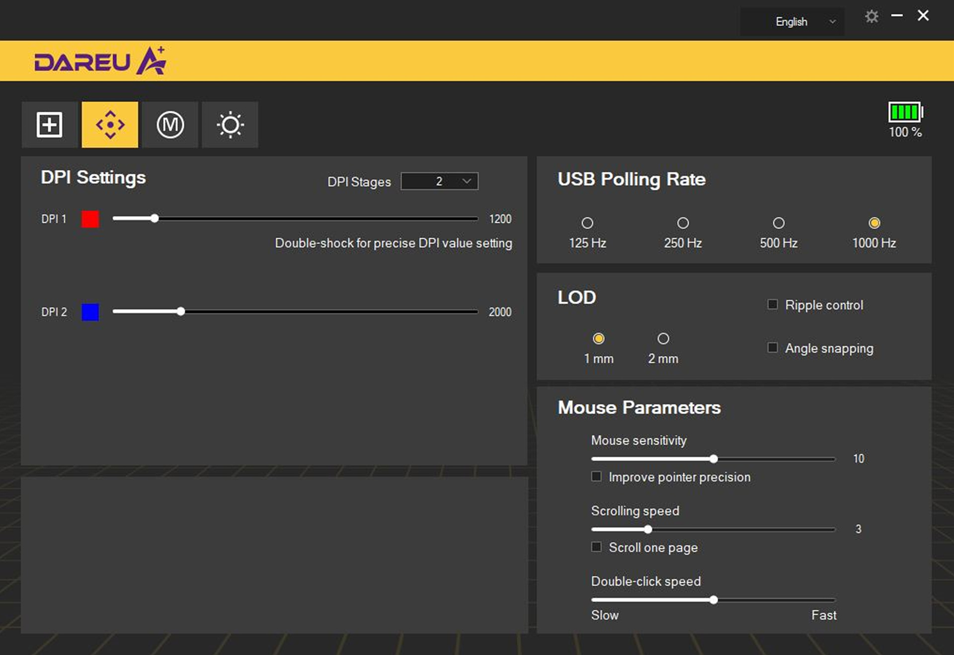 DPI는 총 5단계로 설정할 수 있지만 사용 환경에 따라 원하는 대로 단계만 설정해서 사용할 수 있습니다. DPI의 단계별로 켜지는 LED 색도 바꿀 수 있습니다.