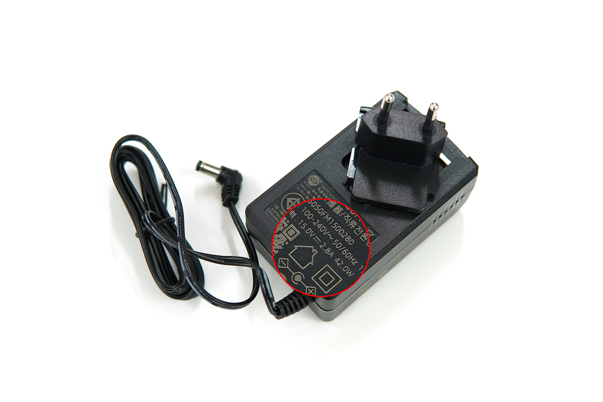 어댑터에 국가별 플러그를 꽂아서 사용할 수 있으며 15V / 2.8A의 출력을 가지고 있습니다.