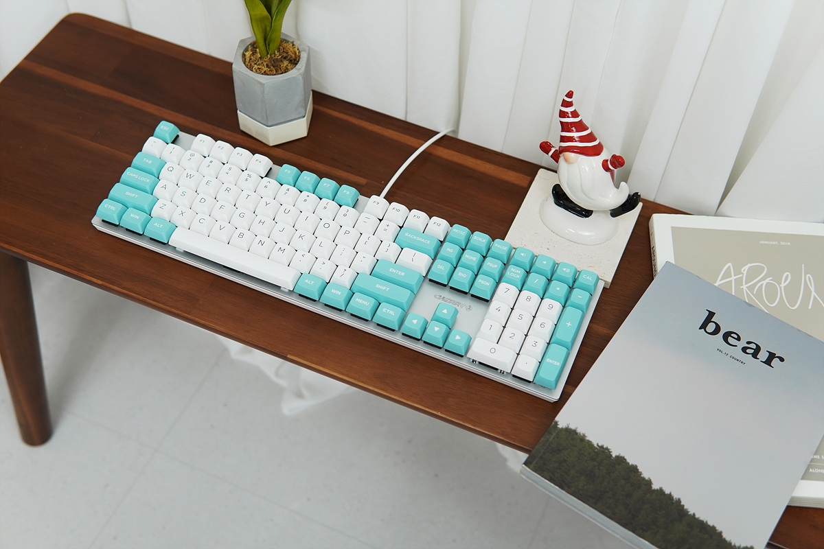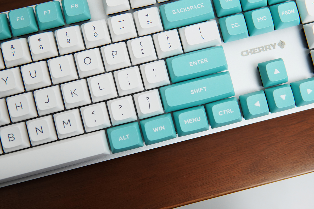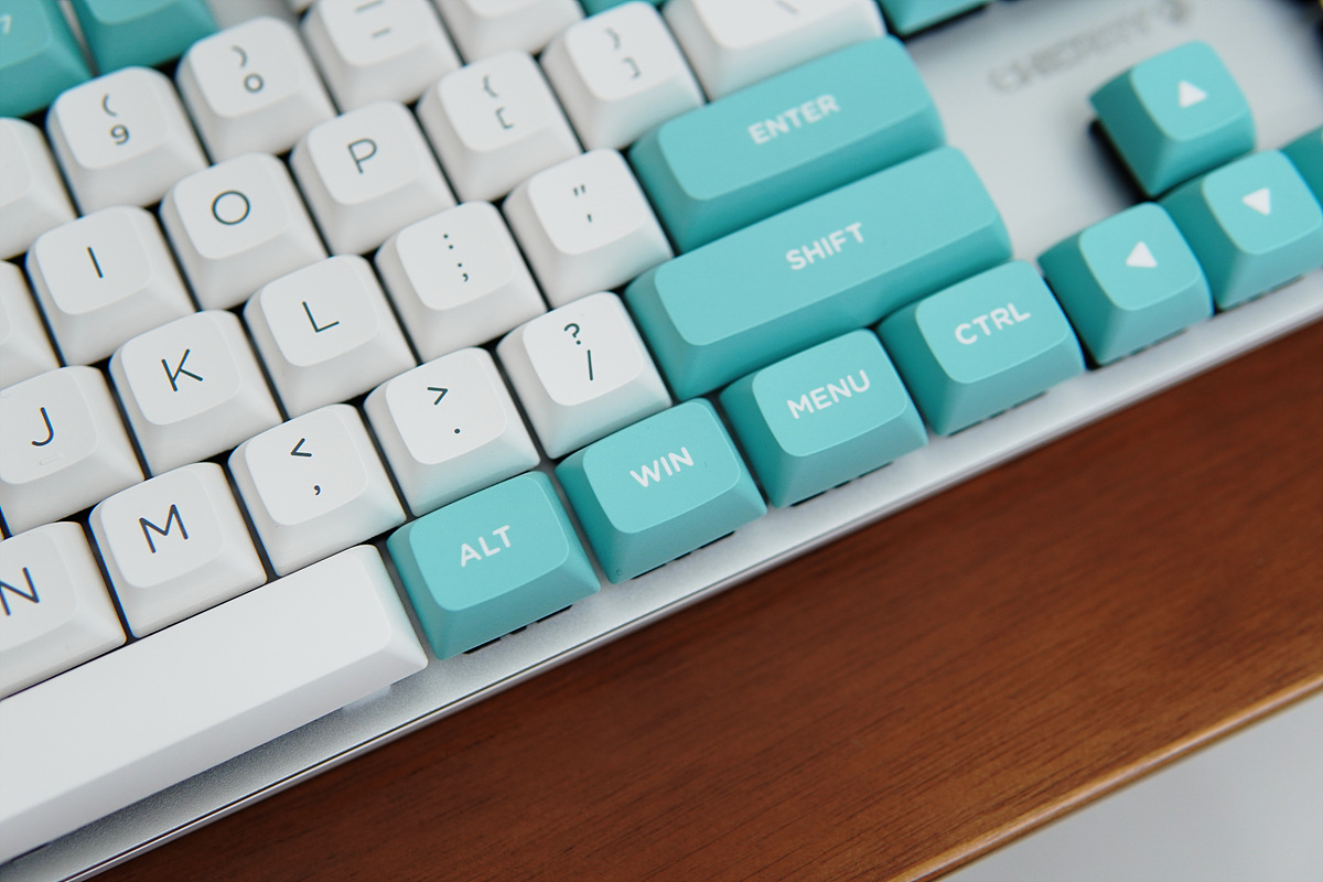 XDA 키캡의 디자인과 컬러(Color)로 산뜻한 느낌이며 민초단에게도 상당히 환영을 받을 거 같네요. KC200의 키캡은 한/영이 아닌 영어로만 되어있으며 글자 역시 크게 각인되어 있어서 XDA와 상당히 잘 맞는 모습입니다. 체리나 OEM 프로파일 키캡과는 다르게 일정한 높이를 같은 XDA, DSA 키캡은 이렇게 큰 영문으로 표시된 모습이 더 예쁘더군요. 키캡 높이(프로파일)에 대한 적응은 사용자마다 달라질 수 있겠지만 확실히 디자인은 정말 예쁩니다.