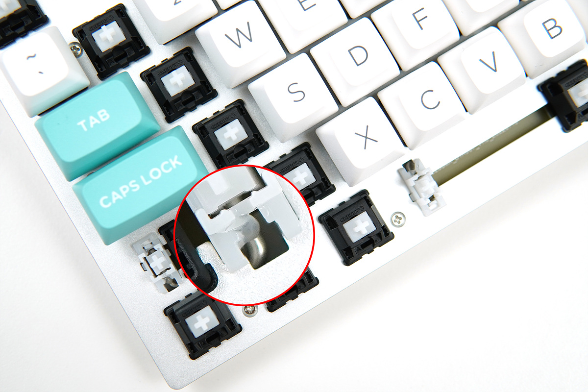 MX 백축 스위치는 정방향으로 장착이 되었으며 LED가 아예 없는 non-LED 방식으로 화려한 RGB를 원하는 분들과는 맞지 않겠지만 반대로 LED를 싫어하는 분들에게는 오히려 반가운 부분이죠. 스테빌라이저는 체리 방식으로 되어있으며 따로 윤활이 되어있어서 철심 소리를 많이 줄여주었습니다.