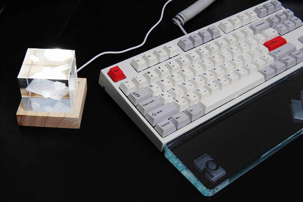 87 key 배열의 텐키리스 크기에 맞는 팜레스트는 360mm x 80mm의 크기로 되어있으며 책상 위를 좀 더 멋지게 꾸며줄 수 있는 60mm의 정육각형의 큐브와 LED 조명을 포함하고 있습니다. 팜레스트와 큐브의 재질은 크리스탈로 되어있어서 기존 강화유리 팜레스트보다 훨씬 더 높은 투명도를 보여주고 있습니다.