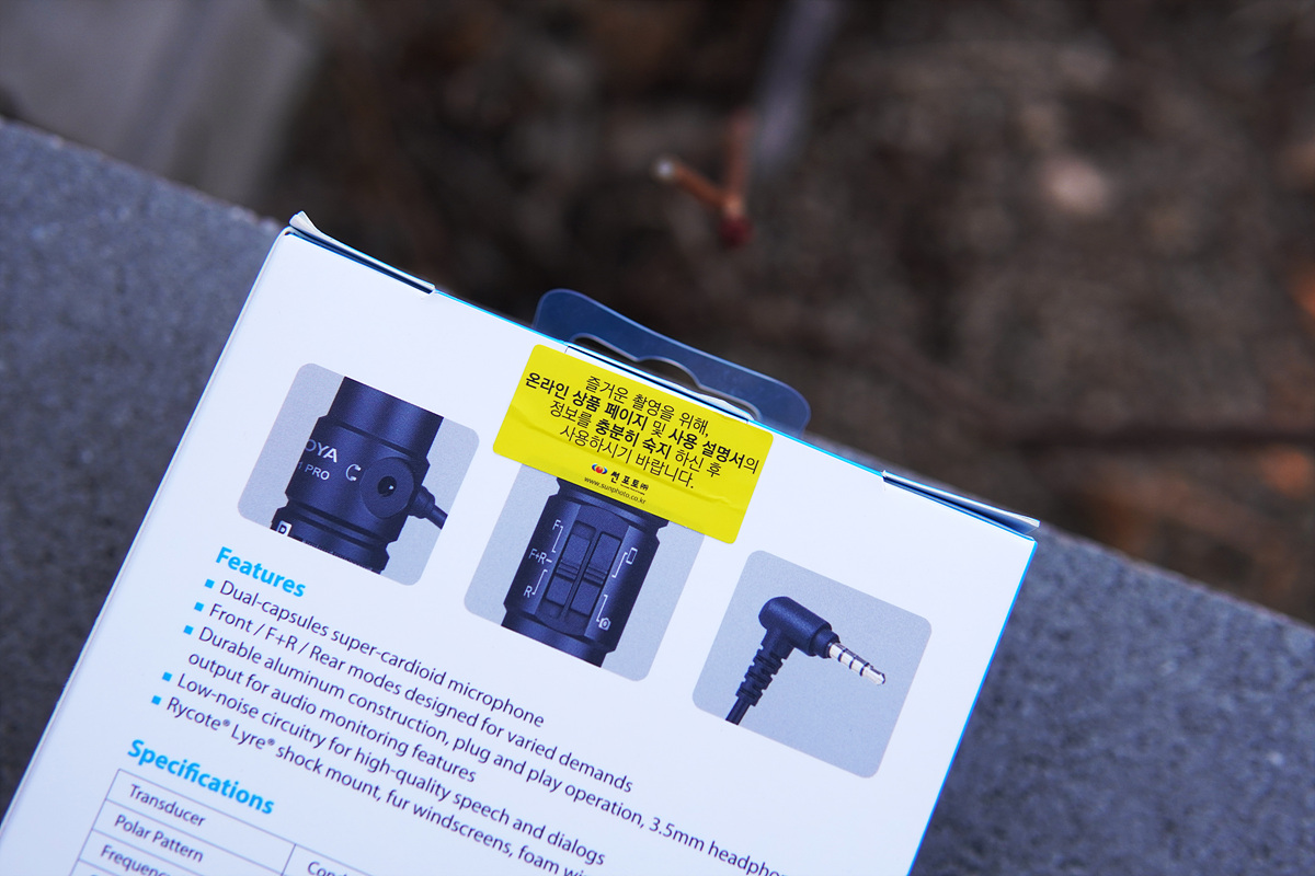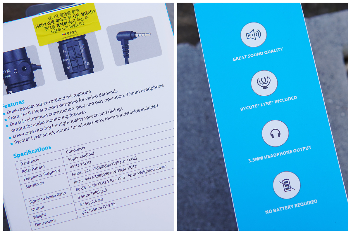 박스에는 제품의 스펙과 함께 특징들이 잘 나타나 있습니다. 현재 BY-MM1을 사용하고 있기 때문에 가장 눈에 들어오는 부분이 두 개의 마이크(캡슐)와 마이크를 고정할 수 있는 쇼크 마운트 였습니다. MM1이나 MM1 Pro 모두 콘덴서 타입의 마이크이며 3.5mm 케이블(TRS / TRRS)로 연결하기 때문에 카메라, 스마트폰은 물론 노트북이나 PC에서도 별다른 설정 없이 쉽게 사용할 수 있습니다.