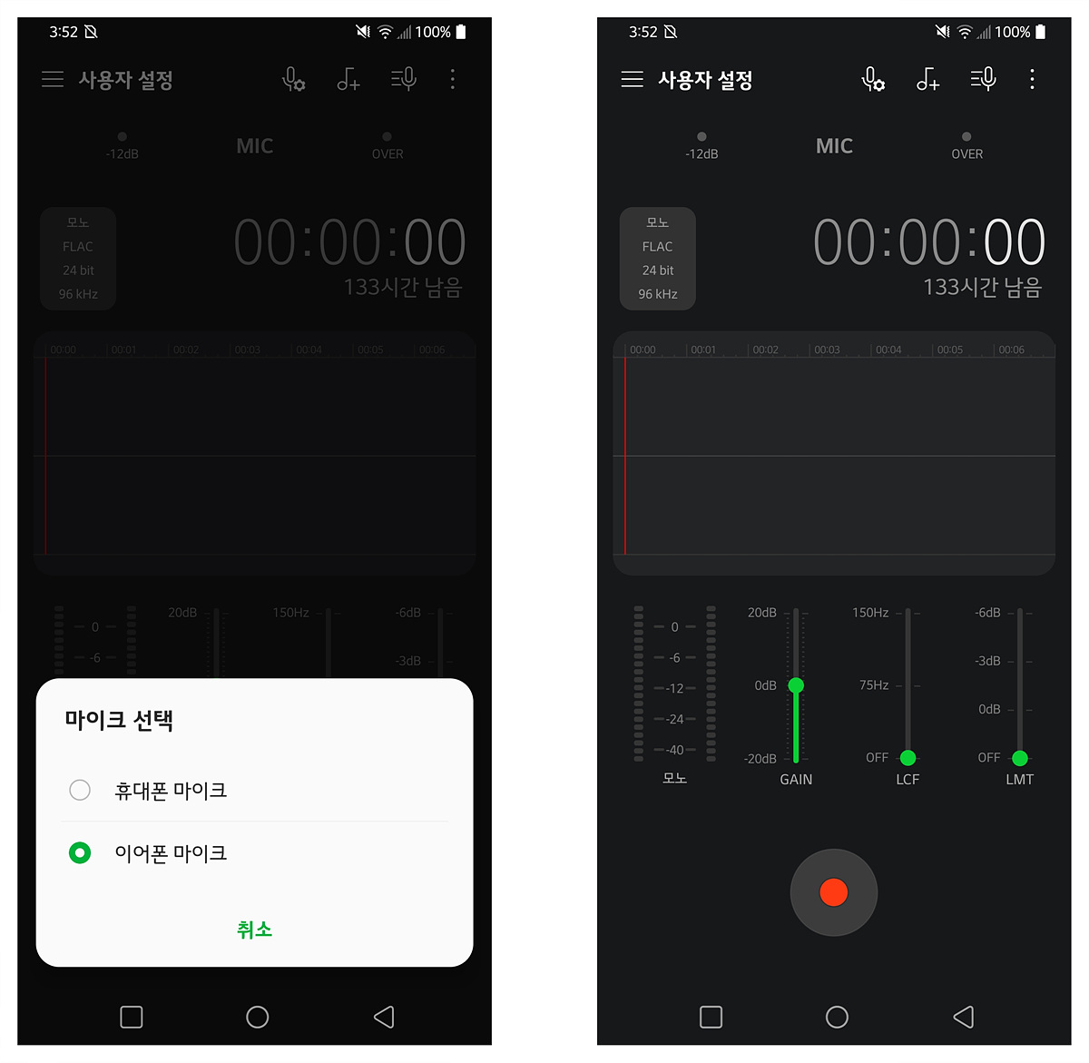 스마트폰의 기종에 따라서 다르겠지만 음성 녹음을 할 때는 외장 마이크로 선택이 되었는지도 꼭 확인하시기 바랍니다. 제가 사용하는 LG폰 기준으로는 동영상 촬영은 외장 마이크를 사용한다는 안내가 됩니다.