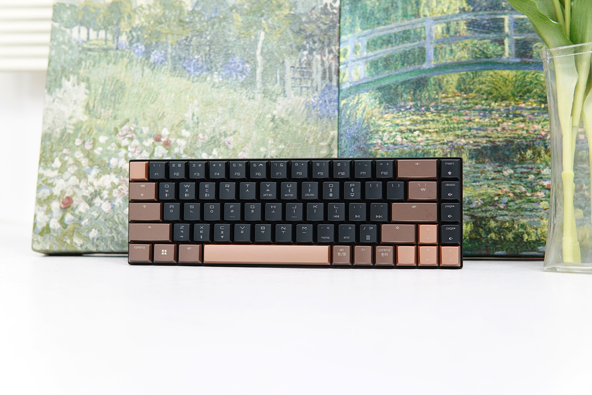 펑션키가 없는 68 key 미니 배열이라 상당히 깜찍한 느낌이었으며 블랙 / 퍼플 / 골드 3가지 색이 있는데 소개하는 키보드는 블랙 제품입니다. 모디열과 방향키의 골드는 색은 서로 다른 색으로 나름 포인트를 주고 있습니다.