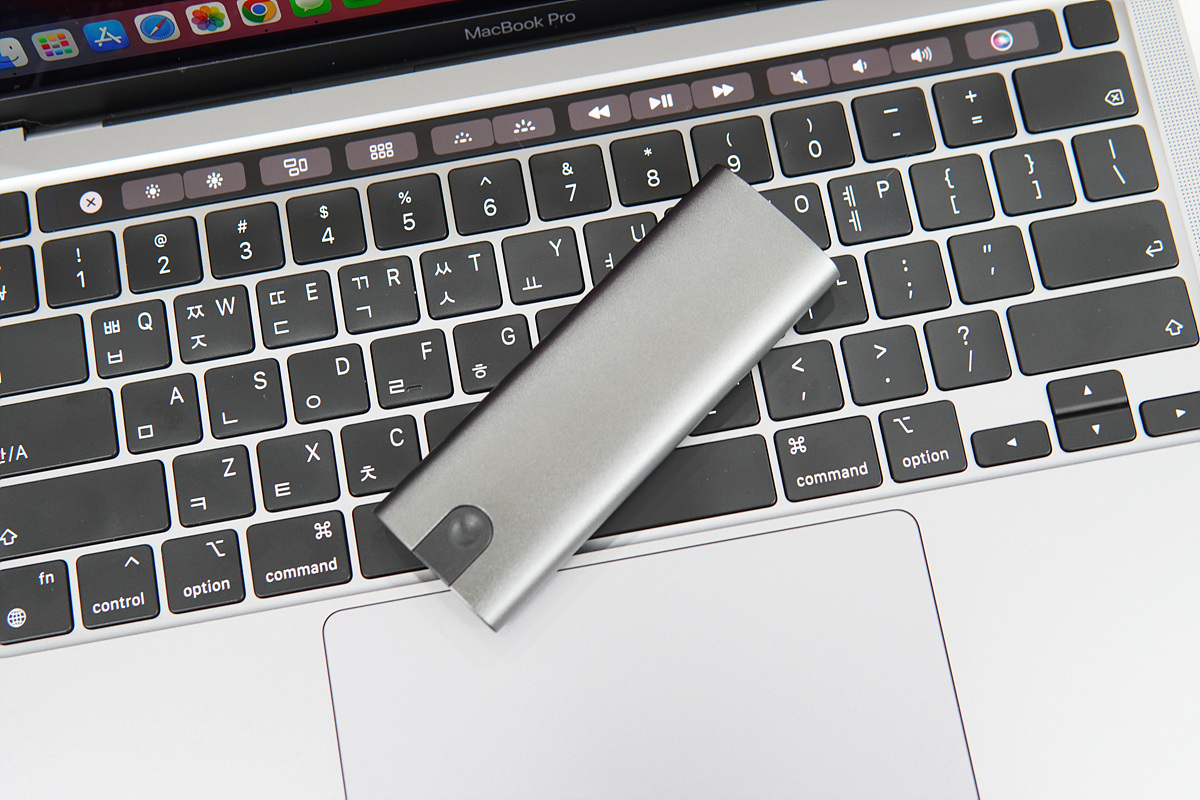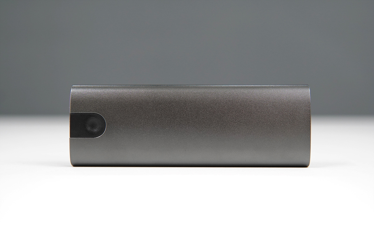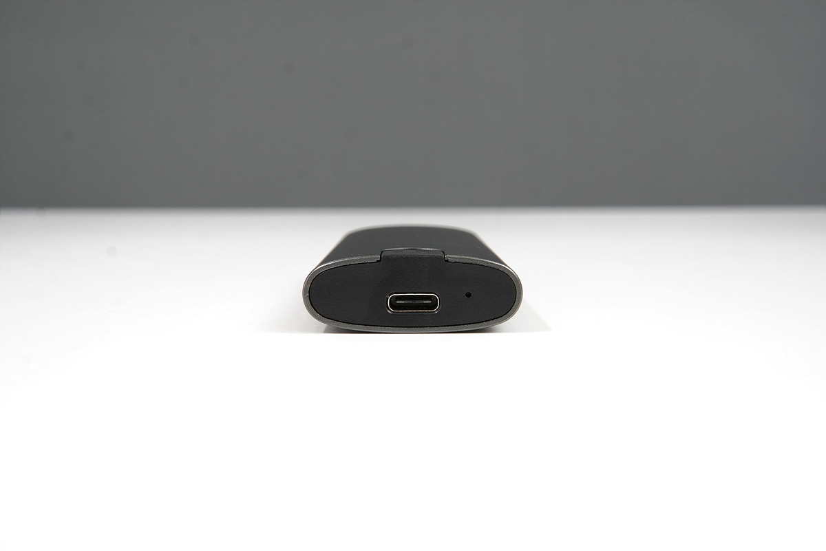 케이스는 알루미늄 재질로 애플 기기에서 사용되는 스페이스 그레이보다 조금 더 진한 색이며 측면에는 USB Type-C 포트와 상태 표시 LED가 있습니다.