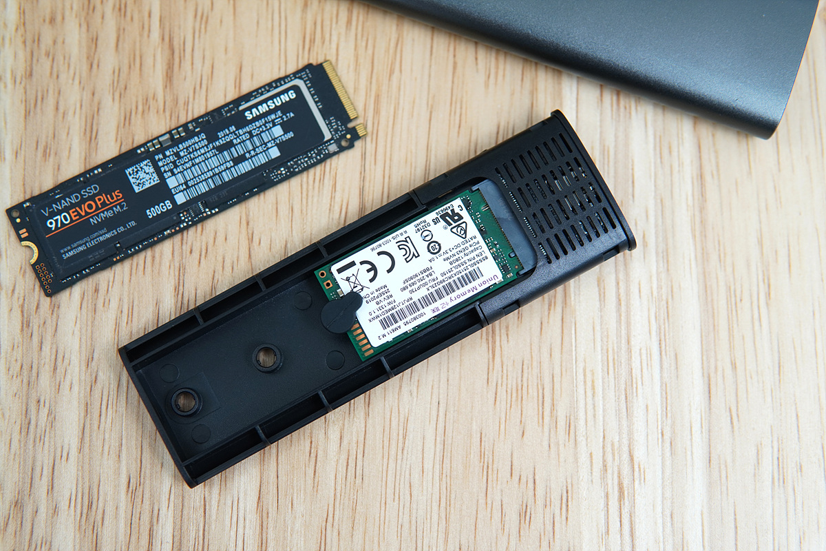 테스트에 사용할 SSD는 삼성 970 EVO Plus와 LG gram 노트북에서 적출한 SSD입니다. 두 제품 모두 NVMe 방식으로 SSD의 홈에 따라 M, B+M 두 가지 모두 사용할 수 있습니다. 왼쪽에 홈이 있는 B 방식의 SATA 방식의 SSD는 사용할 수 없으니 구입하기 전에 꼭 확인하시기 바랍니다. 인터페이스(SATA / NVMe)에 따른 제약은 있지만 PCIe 3.0 / 4.0과 같은 대역폭의 제한은 없습니다.