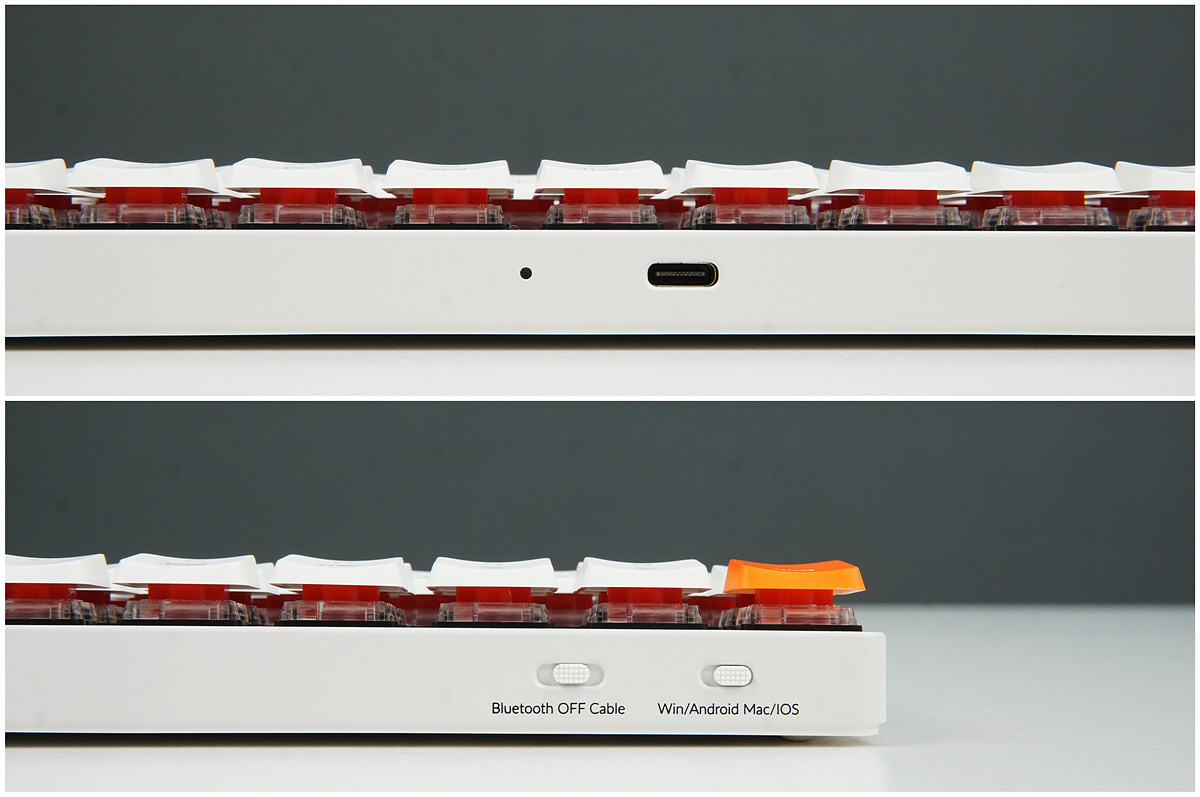 위쪽 측면에는 Type-C 포트가 있어서 유선 모드와 함께 키보드의 충전을 할 수 있으며 상태 표시 LED로 현재 상태를 확인할 수 있습니다. K3 레트로 키보드는 유선 / 블루투스는 물론 사용하는 기기(OS)에 따라 모드 선택을 할 수 있습니다. (키크론 제품의 가장 큰 특징 중 하나입니다. ^^)