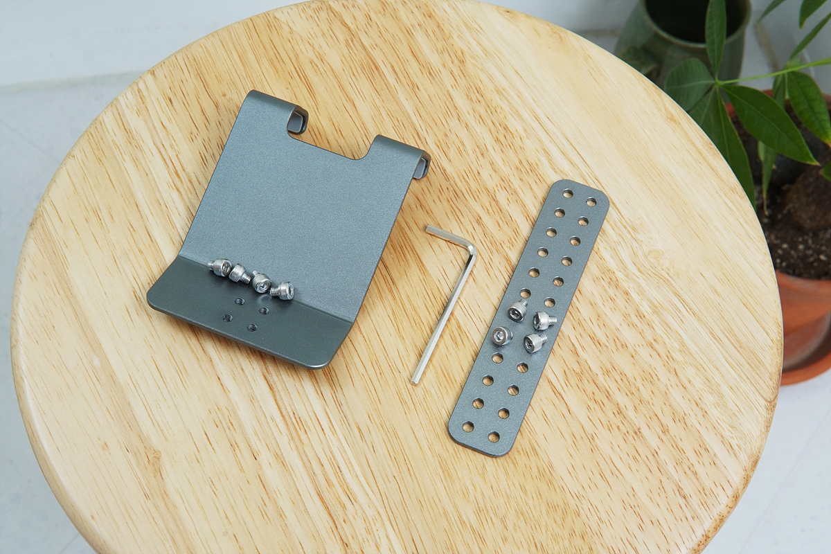 스탠드의 아래쪽에 고정을 한다면 4개의 볼트를 모두 사용할 수 있으며 이때는 스마트폰뿐 아니라 태블릿을 거치할 수 있습니다. 좌우로 사용할 때는 무게 중심에 조금 더 조심해야 합니다.