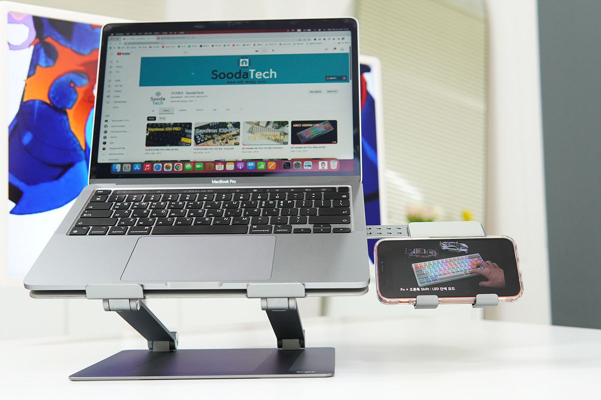 스탠드의 고정력도 좋아서 2kg의 16인치 노트북에서도 너끈하게 사용할 수 있었으며 무엇보다 멀티 스탠드로 스마트폰이나 태블릿까지 편리하게 사용할 수 있으니 활용도를 더욱 높일 수 있습니다. 노트북과 태블릿을 같이 사용하는 분들에게는 필수품이며 개인적으로는 대학생들에게 꽤 유용한 아이템이라 생각합니다.