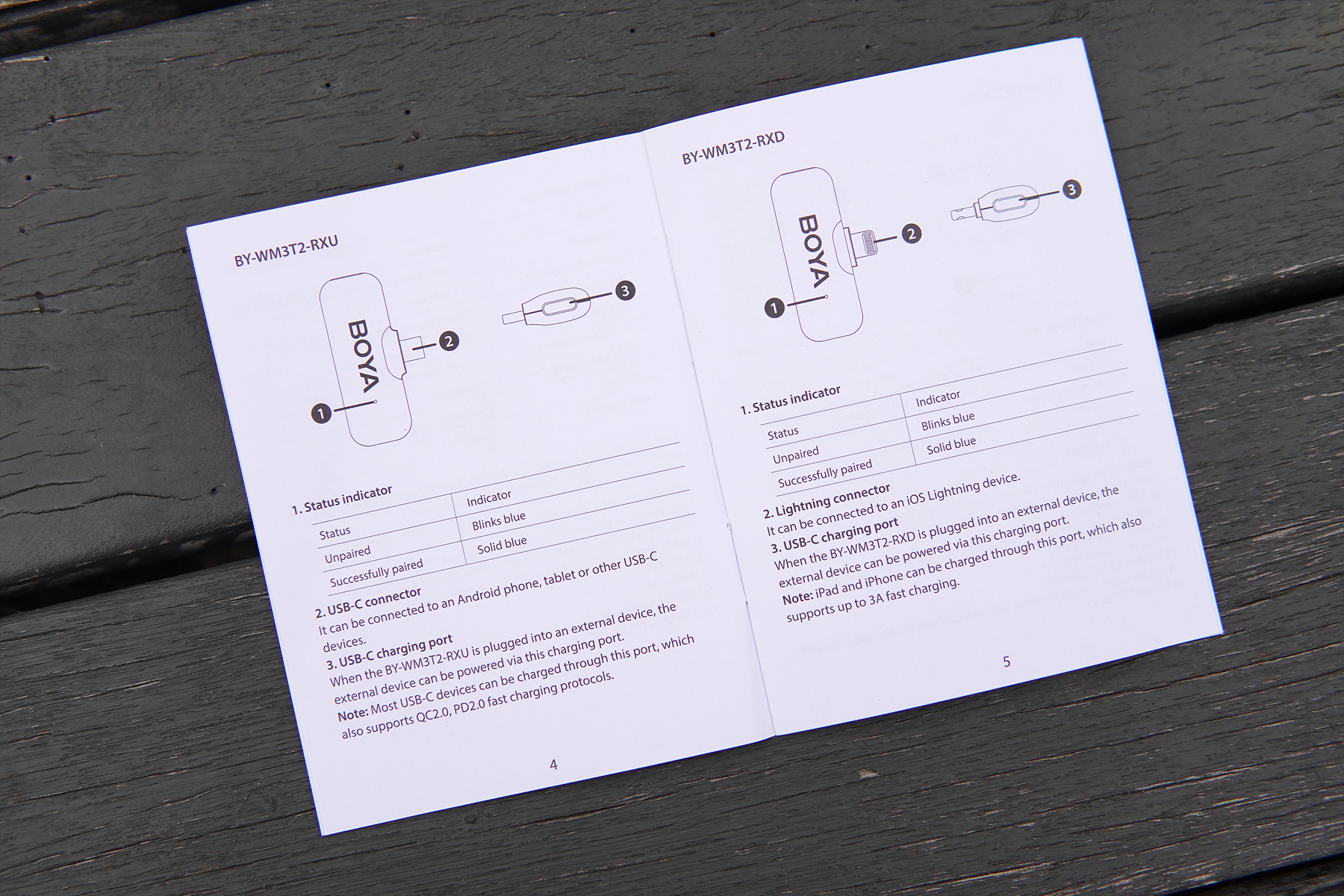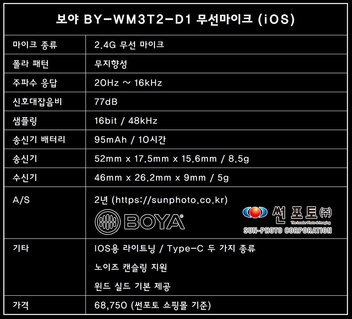 뒤에 붙은 숫자 1, 2는 송신기의 개수를 뜻하며 BY-WM3T2-D1은 아이폰이나 아이패드에서 사용할 수 있는 라이트닝 단자이며 수신기와 송신기 각각 한 개로 이루어진 마이크입니다.