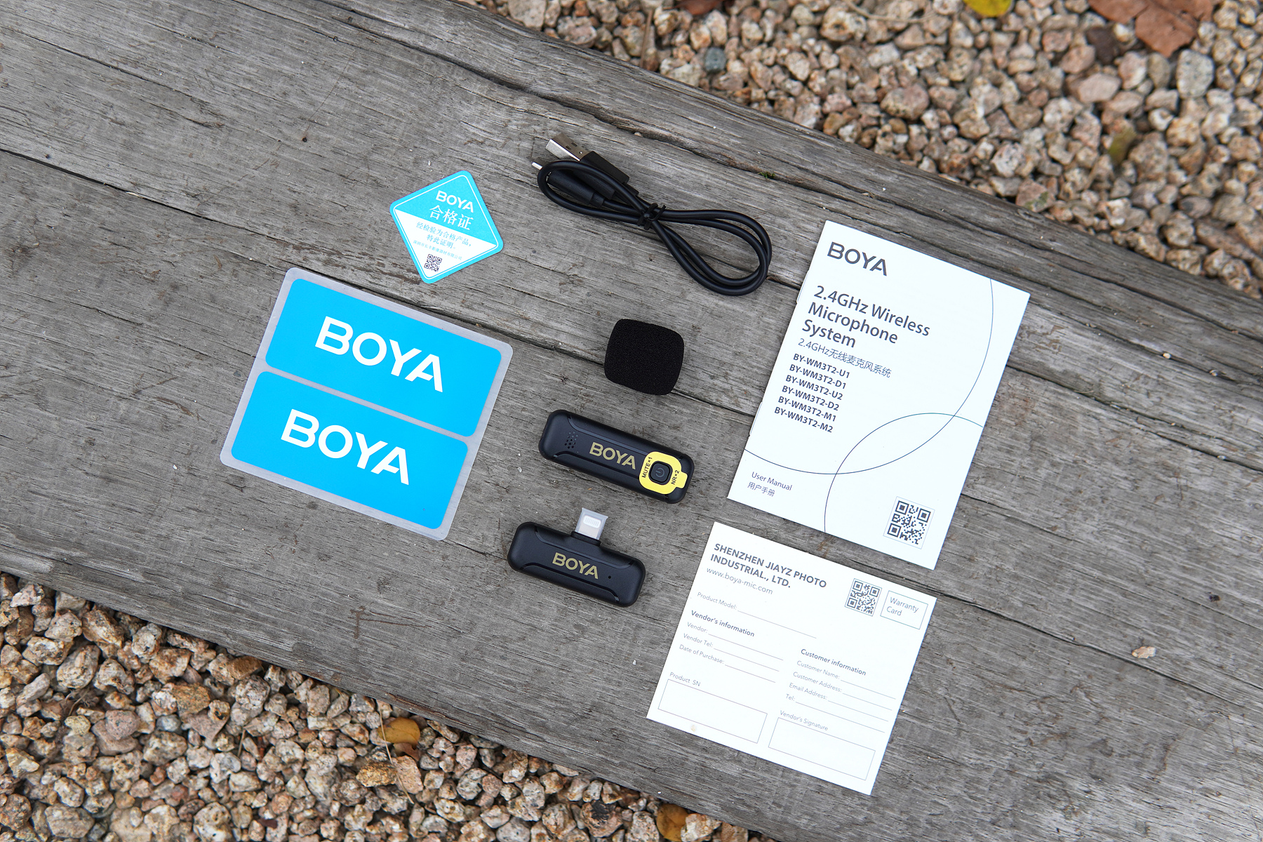 수신기, 송신기, 폼재질의 윈드 스크린, 충전 케이블, 스티커와 설명서로 이루어져 있습니다.
