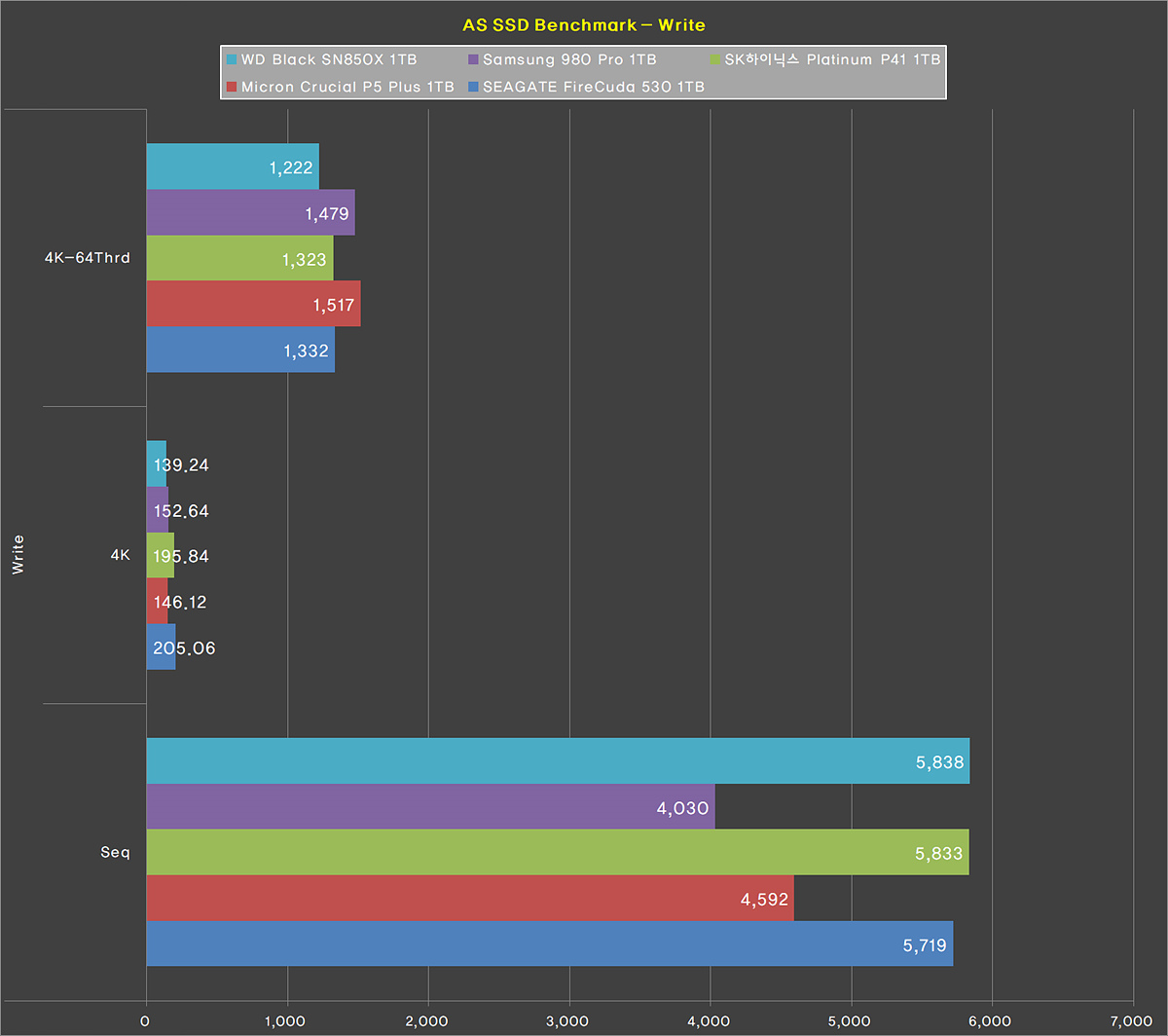 현재 PCIe 4.0 SSD 중에서 가장 대표적인 980 Pro / P41 / P5 Plus / 파이어쿠다 530 제품들과 비교해보면 확실히 4K의 읽기와 쓰기 속도에서 차이를 보이고 있습니다. 기존에 WD 제품들은 읽기 4K 테스트에서 다들 좋은 수치를 보여줬었는데 이번에는 읽기와 쓰기 모두 측정 결과가 좋지 않았습니다.